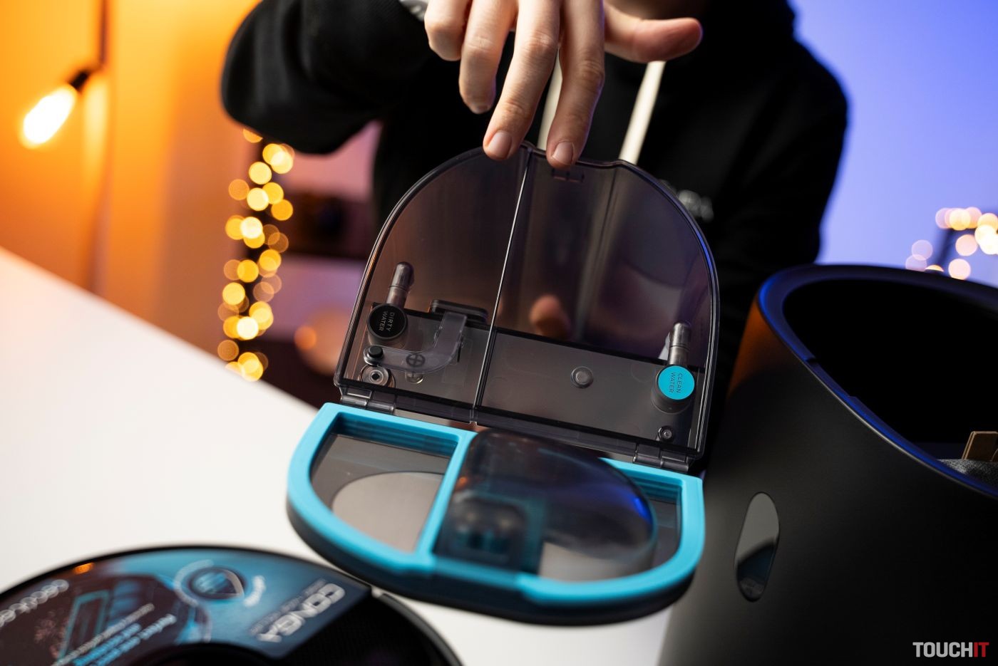 Súčasťou dokovacej stanice je kombinovaná nádobka na čistú a špinavú vodu. Časť pre čistú vodu má objem 2,6 litra, špinavá voda sa vypúšťa do nádoby s objemom 1,3 litra. Keďže ide o kombinovanú nádobku, pri vylievaní špinavej vody pravdepodobne vylejete aj zvyšok čistej vody.