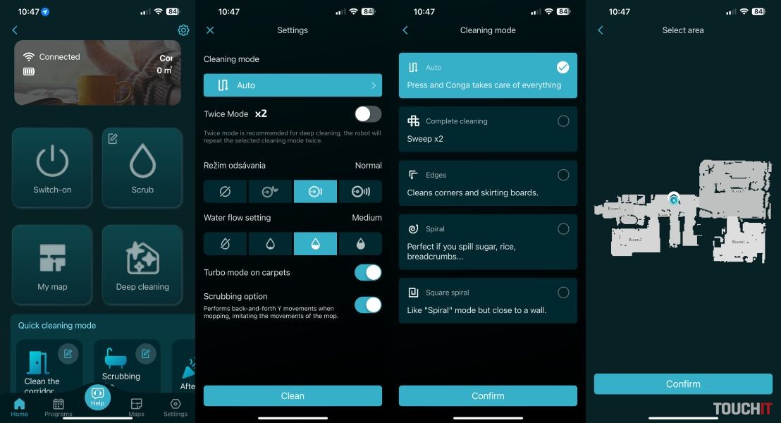 Vysávač ponúka režim vysávania, mopovania alebo aj vysávania aj mopovania. V prípade mopovania si môžete aktivovať režim navigácie do písmena Y pre efektívnejšie mopovanie. Rovnako si môžete prispôsobiť správanie na kobercoch, pričom platí, že v režime mopovania sa Conga 12090 automaticky vyhne kobercom.