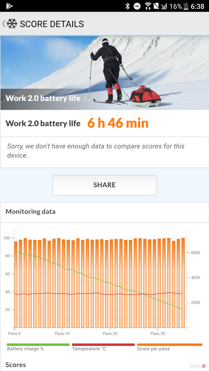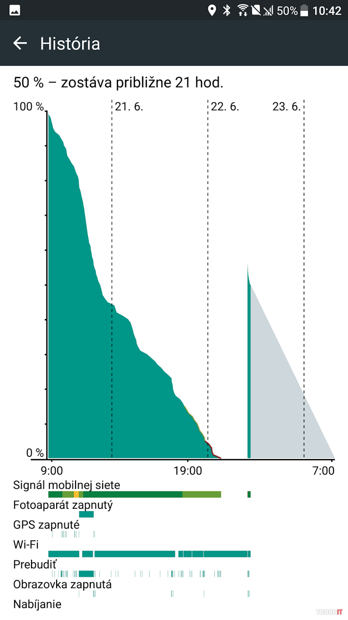 Telefón má vo výbave 3000 mAh batériu. Popravde, od 5,5-palcového zariadenia by sme očakávali o trochu vyššiu kapacitu, ale batéria nás vo výsledku neobmedzovala. Počas bežného pracovného dňa nám telefón vydržal celý deň a keď sme ho nechali na stole a používali sme ho iba občasne, dosiahli sme vydrž dvoch dní. Telefón bol neustále pripojený do internetu a s aktívnou synchronizáciou. Nabíjanie je vďaka podpore technológie Quick Charge 3.0 rýchle, do 90 minút sa dostanete z takmer vybitej batérie na takmer 100%. Je to taký štandard a pri používaní HTC U11 sme sa správali v podstate rovnako ako aj pri testovaní ostatných vlajkových lodí s o niečo väčšou kapacitou batérie. Keď sme vedeli, že nás čaká náročný deň a budeme používať dlhšiu dobu GPS navigáciu a fotiť / točiť video, vždy sme mali po ruke powerbanku. Do práce počas štandardného dňa sme si ju však so sebou nebrali. V aplikácii PCMark sme pri neustále zapnutom displeji so stredným nastavením jasu a s na výkon rôzne náročnými aktivitami namerali hodnotu 6:46.