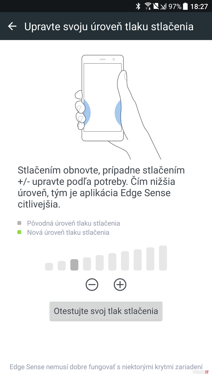 Edge Sense si takisto v rámci prvého spustenia telefónu prispôsobíte. Telefón dokáže rozoznať niekoľko úrovní stisku, my sme preferovali citlivejšie nastavenie. Úroveň tlaku je dodatočne možné zmeniť a takisto je možné aktivovať rozšírený režim, kedy telefón reaguje na krátke a dlhé stlačenie a podľa toho vykoná jednu z dvoch akcií. Krátke stlačenie sme používali na spustenie fotoaparátu a dlhé stlačenie aktivovalo svetlo. Medzi ďalšie dostupné skratky patrí spustenie hlasového asistenta, rýchle spustenie vybranej aplikácie, vytvorenie screenshotu obrazovky alebo zapnutie nahrávania zvuku či zapnutie/vypnutie Wi-Fi hotspotu. Taktiež je možné nastaviť, či má byť funkcia aktívna pri vypnutej obrazovke. My sme mali toto nastavenie povolené pre rýchle spustenie skratiek. Vypnúť si môžete aj vizuálnu odozvu a vibrácie, ktoré vás upozorňujú na aktiváciu funkcie. Vibrácie sú však užitočnou pomôckou, nakoľko hrany telefónu sú pevné a na ich tvare necítite, že telefón stláčate. Ich tvar sa nemení a v prípade vypnutého displeja sú jedinou spätnou väzbou práve vibrácie. Ako sme už spomenuli, Edge Sense je prakticky doplnok, ktorý sme využívali. Nepovažujeme ho za hlavný dôvod, prečo si kúpiť telefón, ale ide o jednu z inovácií, ktorá sa dá reálne využívať aj počas každodennej práce s telefónom. Nastavenie svetla je naozaj praktické a zvykli sme si takýmto spôsobom aktivovať aj fotoaparát – a to aj napriek tomu, že rýchlo ho môžete zapnúť aj dvojitým stlačením tlačidla napájania. Na Edge Sense sme si však rýchlo zvykli.