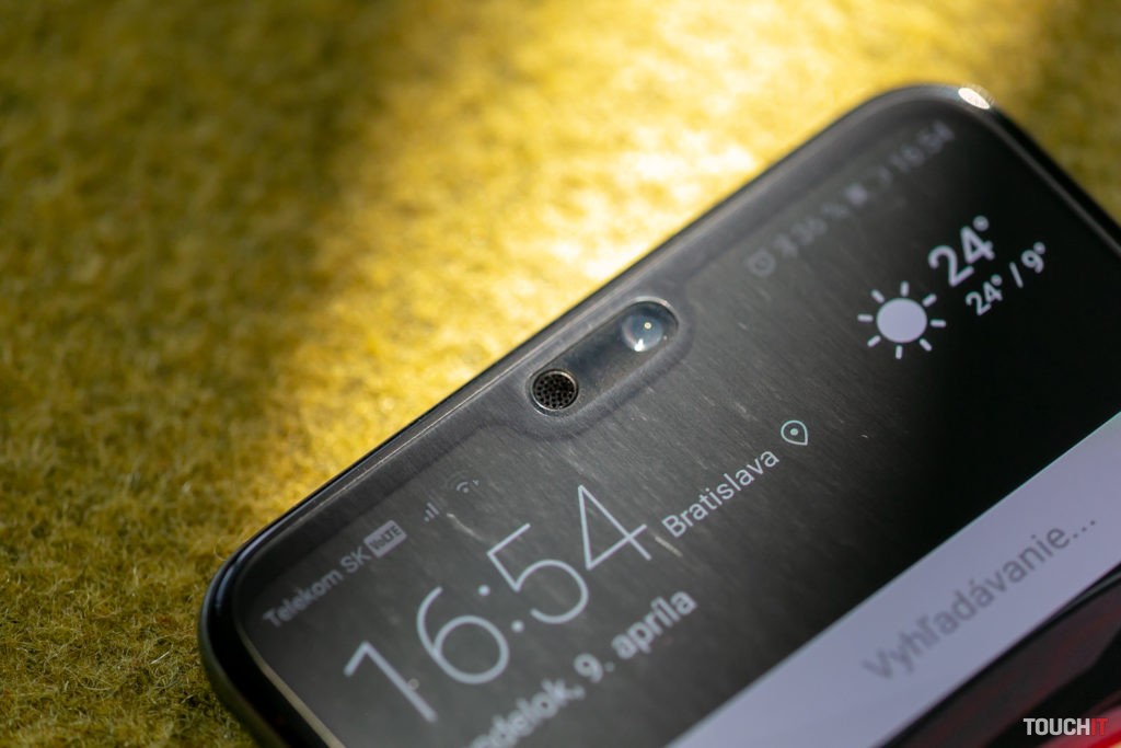 Výrez v sebe obsahuje 24 Mpx predný fotoaparát a okrúhly reproduktor, ktorý sa využíva pri telefonovaní a reprodukcii multimédií. Huawei do výrezu tiež zakomponoval malú notifikačnú LED diódu. Napriek menšiemu priemeru je výrazná a dobre viditeľná. Spodnú časť obrazovky pokrýva rámik pod displejom so zabudovanou čítačkou odtlačkov prstov. Považujeme to za praktickú voľbu, pretože telefón pohodlne odomknete aj keď je položený na stole.