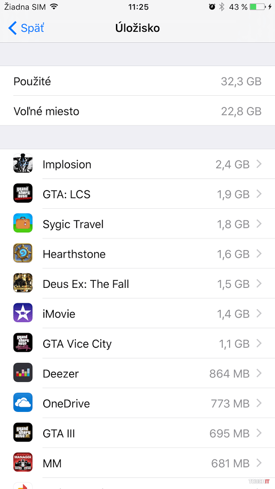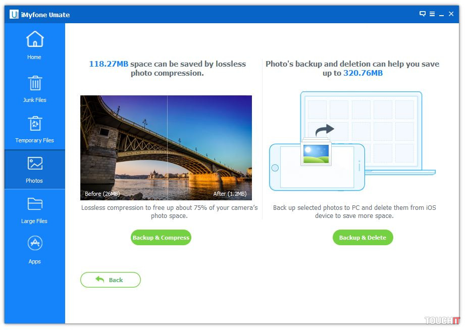 Nástroj Fotky chválime. Aplikácia totiž automaticky zazálohuje fotografie z iPhonu do počítača a na základe vášho rozhodnutia ich skomprimuje, nahrá späť do telefónu alebo iba zachová zálohu v PC. Takýmto spôsobom môžete znížiť využitie úložiska fotkami až o 75%. Oceníte to v prípade, ak si chcete v zariadení uchovávať veľké množstvo fotiek. Nástroj neoptimalizuje screenshoty obrazovky, iba reálne fotografie. Rozlíšenie sa nemení a veľkosť fotiek sa v našom prípade znížila z 1,7 MB na 480 kB. Rozdiely v kvalite sme nepostrehli. Podobnú funkciu ponúka aplikácia Avast Photo Space. Tá však vyžaduje zálohu fotiek do cloudu a potom zmenší ich rozlíšenie v telefóne. Niekomu môže viac vyhovovať riešenie programu iMyfone Umate. Ďalší nástroj umožňuje zmazanie súborov väčších ako 5 MB. iMyfone Umate počas nášho testovania nenašiel 180 MB video, ktoré sme mali uložené v aplikácii VLC. To však môže byť dané obmedzeniami platformy iOS. Veľké videá v systémovej aplikácii Fotky našiel. Opäť je tu možnosť zálohovať dáta. Nástroj Aplikácie považujeme za zbytočný, ale pre niekoho je možnože takéto odinštalovanie aplikácií jednoduchšie v porovnaní s priamym odinštalovaním na domovskej obrazovke. K dispozícii máte prehľad o veľkosti jednotlivých appiek. Program v našom prípade ukazoval zlú veľkosť aplikácie Implosion (16 GB, správne je 2,4 GB), ide o kozmetickú chybu.K dispozícii je aj bezplatná verzia s obmedzenou funkcionalitou