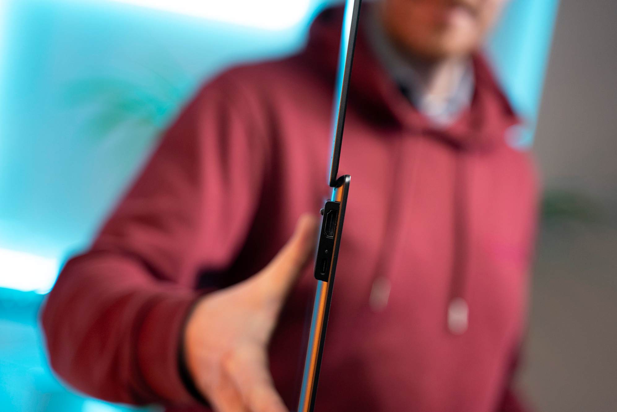 Vďaka tomuto prvku je hrubý len 13 mm a používateľ má k dispozícii základné porty, ktoré by mohol potrebovať. Keďže výrobca chcel priniesť čo najužší dizajn, obmedzil porty na dva Thunderbolt 4.0, HDMI a audiokonektor.