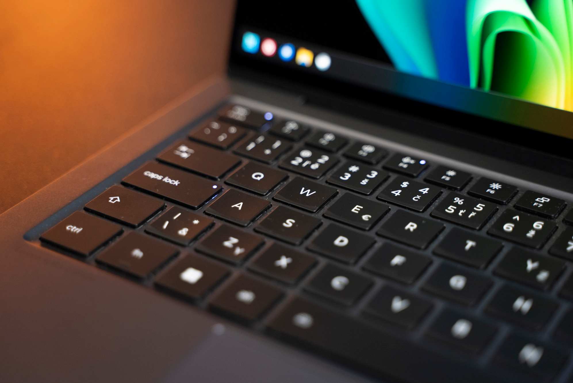 Klávesnica má 2 stupne podsvietenia v bielej farbe. Dá sa nastaviť, aby sa podsvietenie zapínalo automaticky na základe okolitých svetelných podmienok. Klávesnica je pohodlná a vďaka nízkemu zdvihu klávesov sa na nej veľmi dobre a rýchlo píše. Ide o verziu s tlačidlom Copilot namiesto pravého Ctrl.