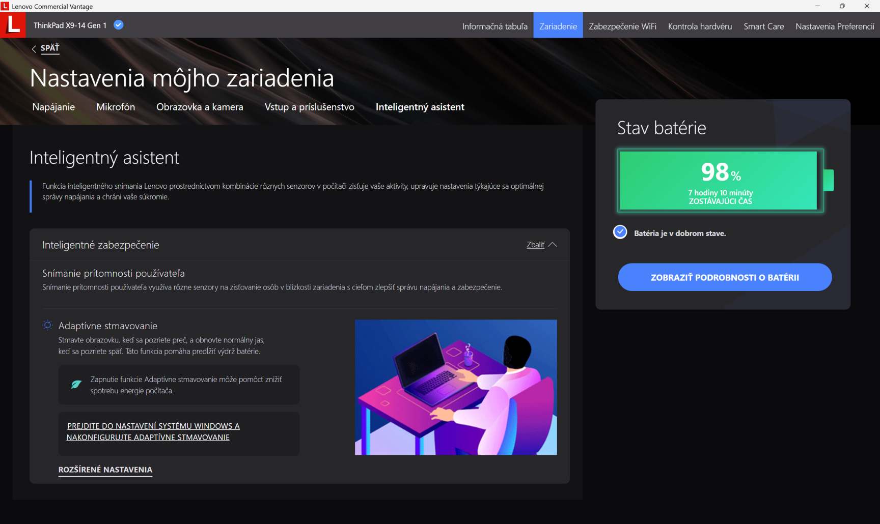 Nástroj slúži na nastavenie napájania alebo aktualizovanie ovládačov a BIOS-u. Nájdete v ňom aj funkcie na prispôsobenie podsvietenia klávesnice alebo napríklad inteligentné ovládanie jasu displeja na základe toho, či sa naň pozeráte. Funkcia je voliteľná a pri jej zapnutí sa dá definovať percentuálna hodnota, na ktorú sa má jas displeja znížiť.