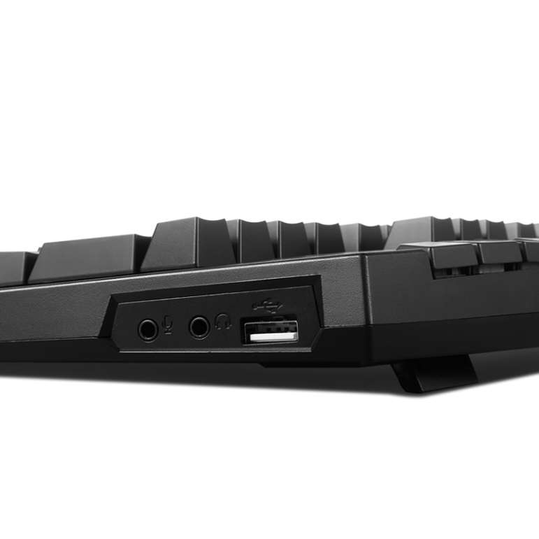 Klávesnica má vo výbave aj jeden USB port a výstup na slúchadlá a mikrofón. V balení nájdete aj redukciu, ktorá dvojicu 3,5 mm jackov zreguluje na jeden konektor. Pre nastavenie programovateľných klávesov je potrebné stiahnuť softvér, ktorý ponúka pomerne základné funkcie v porovnaní s konkurenciou. Okrem nastavenia funkcií si prispôsobíte aj osvetlenie.