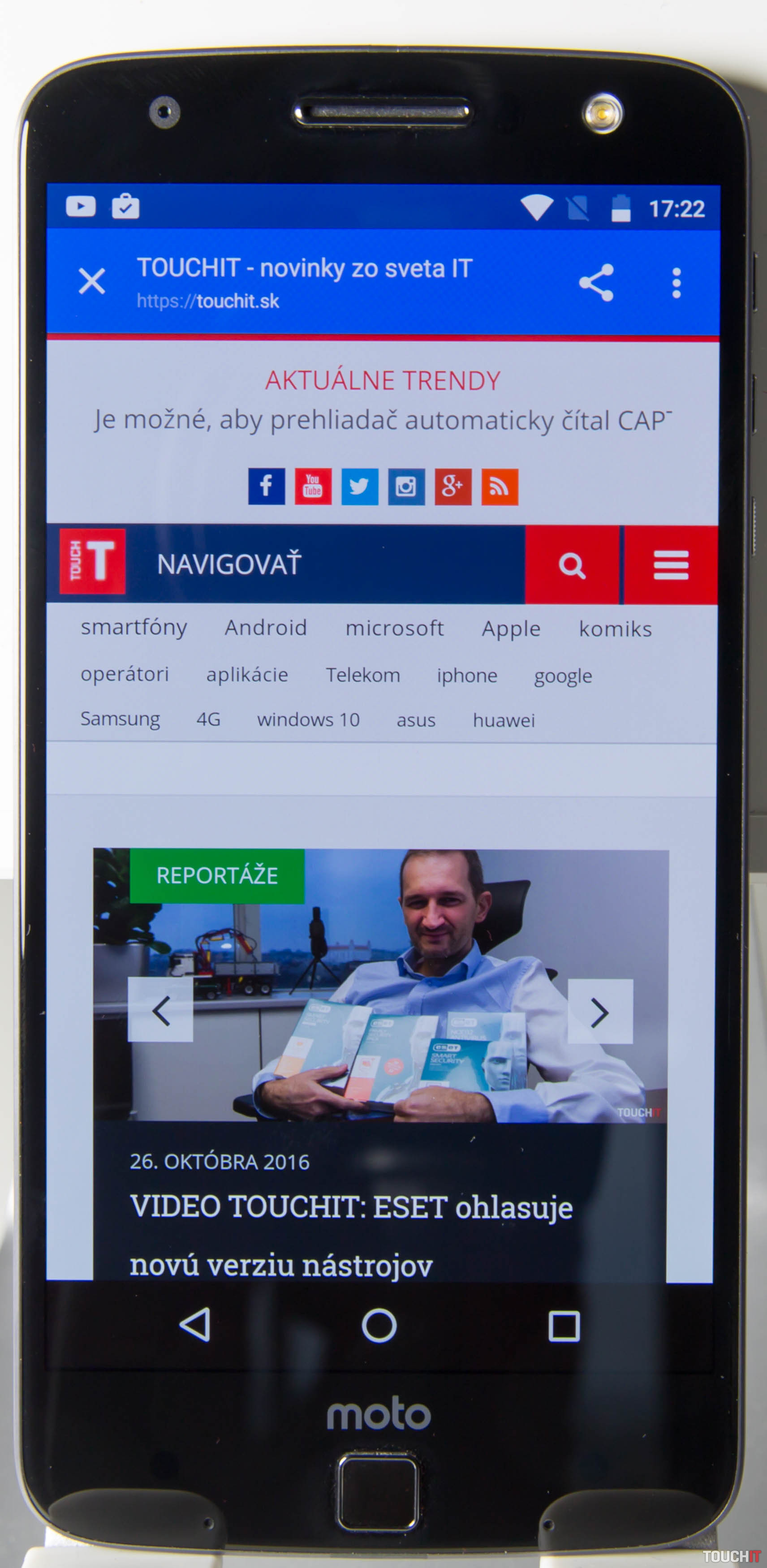 Výbava kráľovTelefón sa z hľadiska výbavy radí medzi aktuálnu špičku. Moto Z poháňa procesor Qualcomm Snapdragon 820 a 4 GB operačná pamäť. Úložisko má 32 GB, vo výbave nájdete aj micro SD kartu, ktorá je umiestnená na spoločnej lište so slotom pre nano SIM kartu. Vďaka čistému Androidu funguje telefón doslova ako blesk, takto rýchle reakcie nie sú vždy medzi Android telefónmi samozrejmosťou. Moto Z má USB-C konektor a jeden reproduktor, ktorý postačuje, ale neohúri. Zadný fotoaparát ponúka rozlíšenie 13 MPx a clonu f/1,8. Nechýba optická stabilizácia ani automatické zaostrovanie laserom a duálny blesk. V tomto smere ťažko niečo vytknúť, fotografie sú výborné najmä v dobrých svetelných podmienkach. Moto Z veľmi dobre využíva HDR a vie verne podať farby. Nadštandardne si poradí aj so slabšie osvetlenými scénami. Nemáme síce pocit, že robí najlepšie fotky na trhu, ale do zoznamu TOP5 foto-telefónov by sa pravdepodobne ešte zmestil. Predný fotoaparát má rozlíšenie 5 MPx a zaujme najmä predným bleskom, ktorý nie je bežnou súčasťou telefónov.