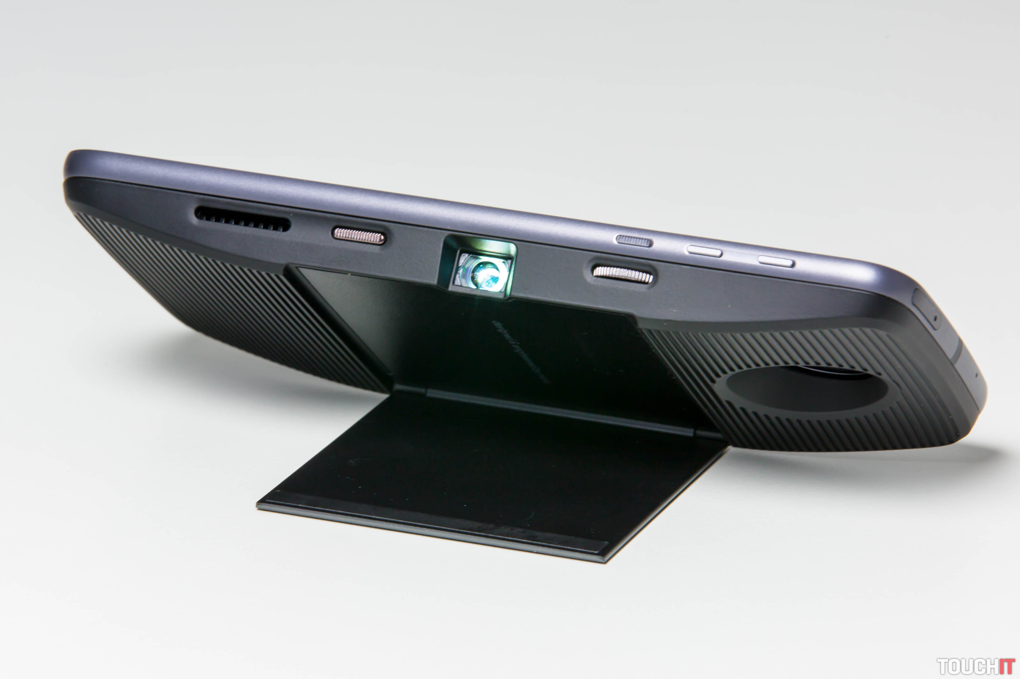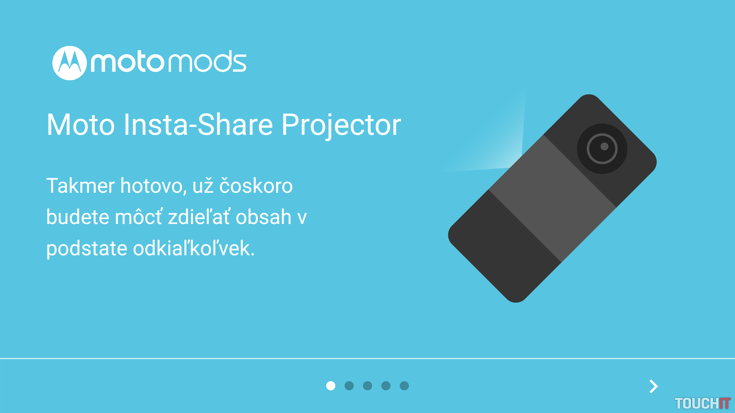Modul Moto Insta-Share Projector umožňuje premietať obraz z telefónu pomocou vreckového projektora. Ten dokáže vytvoriť obraz s uhlopriečkou až 70 palcov a má svetelnosť 50 lm. Nie je veľa, ale vzhľadom k rozmerom projektoru nemožno nič lepšie čakať. V praxi je však projektor veľmi dobre využiteľný, ak sa nachádzate v absolútne tmavej miestnosti. V takýchto prípadoch dokáže vytvoriť dostatočne kvalitný obraz. Škoda, že projektor neobsahuje zabudovaný reproduktor – pre optimálny zážitok budete potrebovať Bluetooth reproduktor, pretože reproduktov v telefóne má svoje limity a dva moduly nie je možné súbežne používať. Cena tohto modulu je 349 eur.