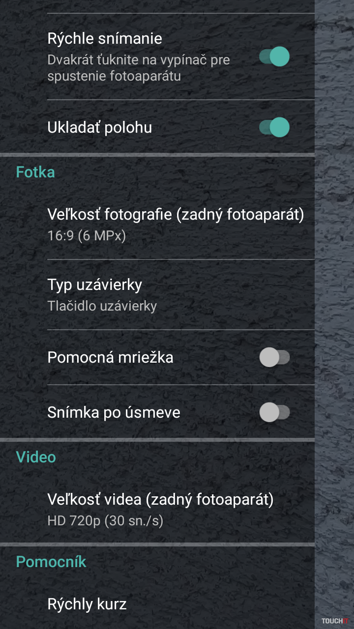 Rýchle spustenie aplikácie fotoaparátu viete vyvolať dvojitým stlačením tlačidla napájania. Ako druhý hardvérový prvok pri ovládaní fotoaparátu sa využívajú tlačidlá pre ovládanie hlasitosti. Tie poslúžia ako spúšť. Nastavenia fotoaparátu sú základné. V ponuke okrem fotenia, nahrávania HD videa pri 30 snimkoch za sekundu, nájdete už iba mód pre vytvorenie panorámy.