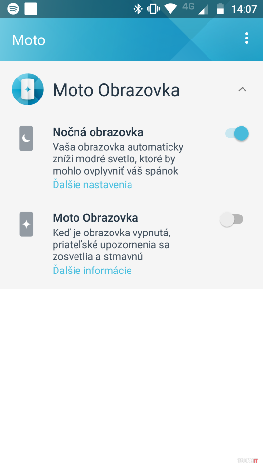 Čistý Android v podaní tohto smartfónu znamená rozšírenie Moto, konkrétne Moto Akcie a Moto Obrazovka. Ide o súpravu, ktorá umožňuje lepšie ovládať smartfón. Napríklad zapnúť fotoaparát pokývaním v ruke a prepnúť ho so režimu selfie opätovným pokývaním. Súčasťou týchto akcií je aj to, že si môžete nastaviť ovládanie gestami na snímači odtlačkov. Dlhým priložením prsta vypnete displej. Pekná funkcia, ktorá vás zbaví virtuálnych tlačidiel.