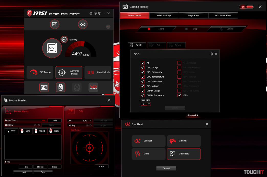 MSI pri návrhu tohto počítača stavilo na množstvo technológií. Niektoré z nich sme už spomenuli, medzi ďalšie patrí napr. Intel Optane pre ešte rýchlejšie načítanie hier, audio technológie so zosilňovačom pre lepšiu kvalitu zvuku po pripojení slúchadiel a priestorový zvuk Nahimic, ktorý nás príjemne potešil už v minulosti pri testovaní herných notebookov od MSI. Počítač tiež prináša optimalizáciu sieťovej prevádzky pri pripojení cez ethernetový kábel a tiež aj rýchlejšie Wi-Fi pripojenie až do 867 Mbps. Užitočné sú tiež USB porty s podporou rýchleho nabíjania a špeciálny port, ktorý je špeciálne vyhradený pre herné príslušenstvo. Je výborné, že mnohé zo spomenutých technológií máte priamo pod kontrolou prostredníctvom viacerých softvérových nástrojov. Základom je MSI Command Center, ktorý umožňuje pretaktovať procesor či meniť nastavenie ventilátorov. Aplikácia MSI Gaming App ponúka ďalšiu várku nastavení pre klávesnicu, myš a monitor a cez aplikáciu Nahimic si upravíte nastavenie zvuku. Možností je veľa, naplno ich využijú hráči, ktorí sa radi hrajú s nastaveniami a prispôsobujú si ich podľa seba. Tí využijú potenciál tohto počítača naplno.