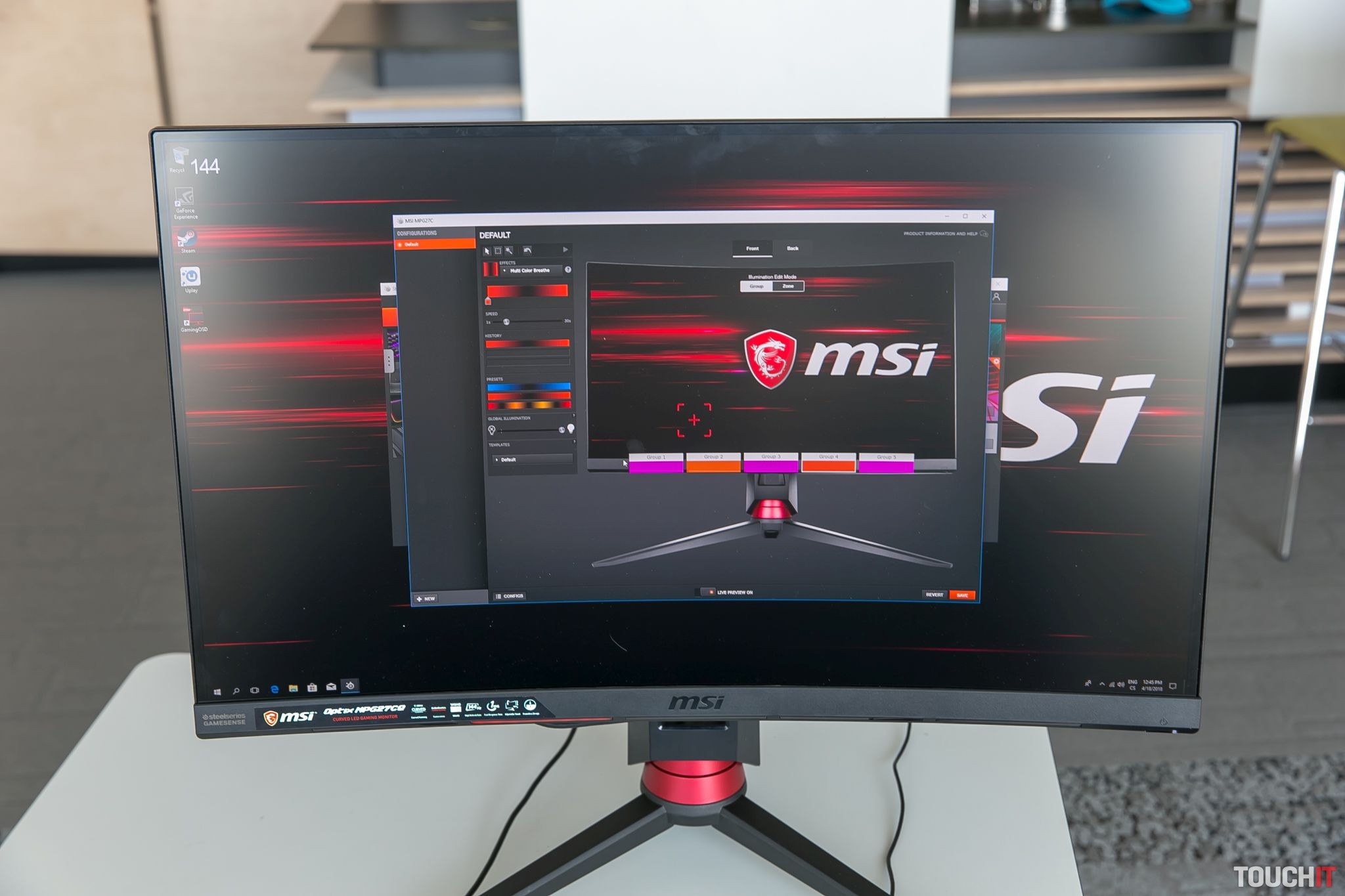MSI Optix MPG27CQ ponúka 5 podsvietených plôch, pričom každú z nich tvorí 8 LED diód. Pomocou softvéru si môžete nastaviť ľubovoľné svetelné efekty pre každú plochu, ale aj pre každú diódu samostatne. Možností je neúrekom a podsvietenie si môžete zadefinovať pre kozmetický efekt alebo aj pre upozornenie na nejakú udalosť, prípadne na vizuálne zobrazenie informácie. Pridanú hodnotu však podporujú iba niektoré hry a služby – spomeňme hry CS:GO, Dota 2, Gigantic a Minecraft alebo aplikácie ako Discord, PrismSync či ImageSync. Škoda, že platformu od SteelSeries nepodporuje viacero výrobcov, takto je dosť pravdepodobné, že podsvietenie budete využívať iba pre kozmetické účely. A to je škoda.