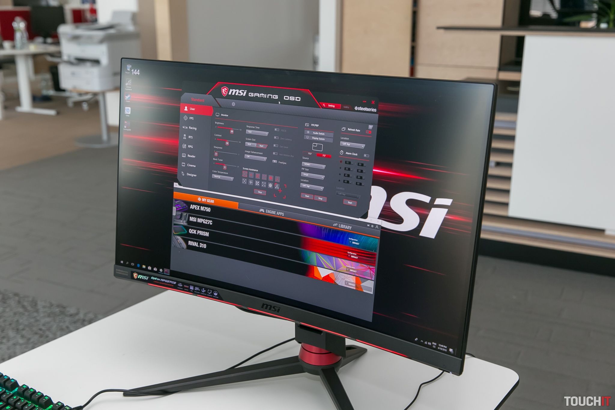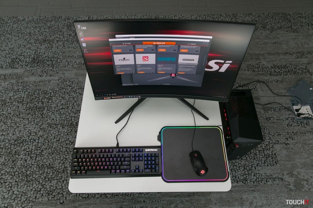 MSI podporuje podsvietenie monitora softvérovou technológiu SteelSeries Engine. V praxi to znamená výbornú softvérovú podporu a tiež aj skvelú synchronizáciu s ďalšími zariadeniami tejto značky. Herné príslušenstvo SteelSeries patrí medzi naše obľúbené, takže sme si testovanie monitora užili v kombinácii s mechanickou klávesnicou, myšou, špeciálnou podložkou pod myš a slúchadlami. Všetky tieto zariadenia pritom podporovali podsvietenie cez SteelSeries Engine a dokázali sa zladiť.