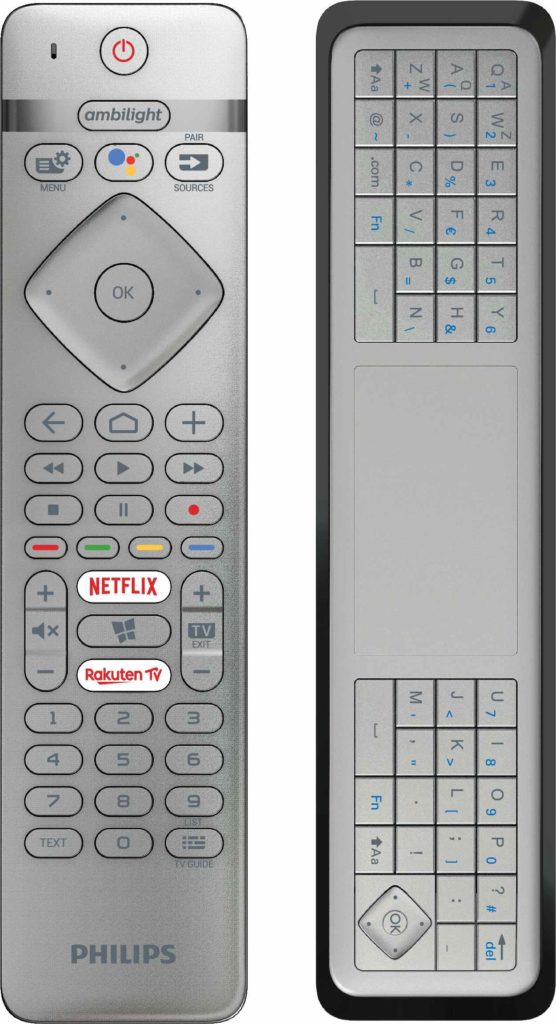 Zaujímavosťou je diaľkové ovládanie, ktoré má na opačnej strane Qwerty klávesnicu. To využijete napr. pri zadávaní adresy webovej stránky alebo pri vyhľadaní filmu či videa na Netflix alebo YouTube. Diaľkové ovládanie má tiež rýchle klávesy pre Netflix a Rakuten TV.