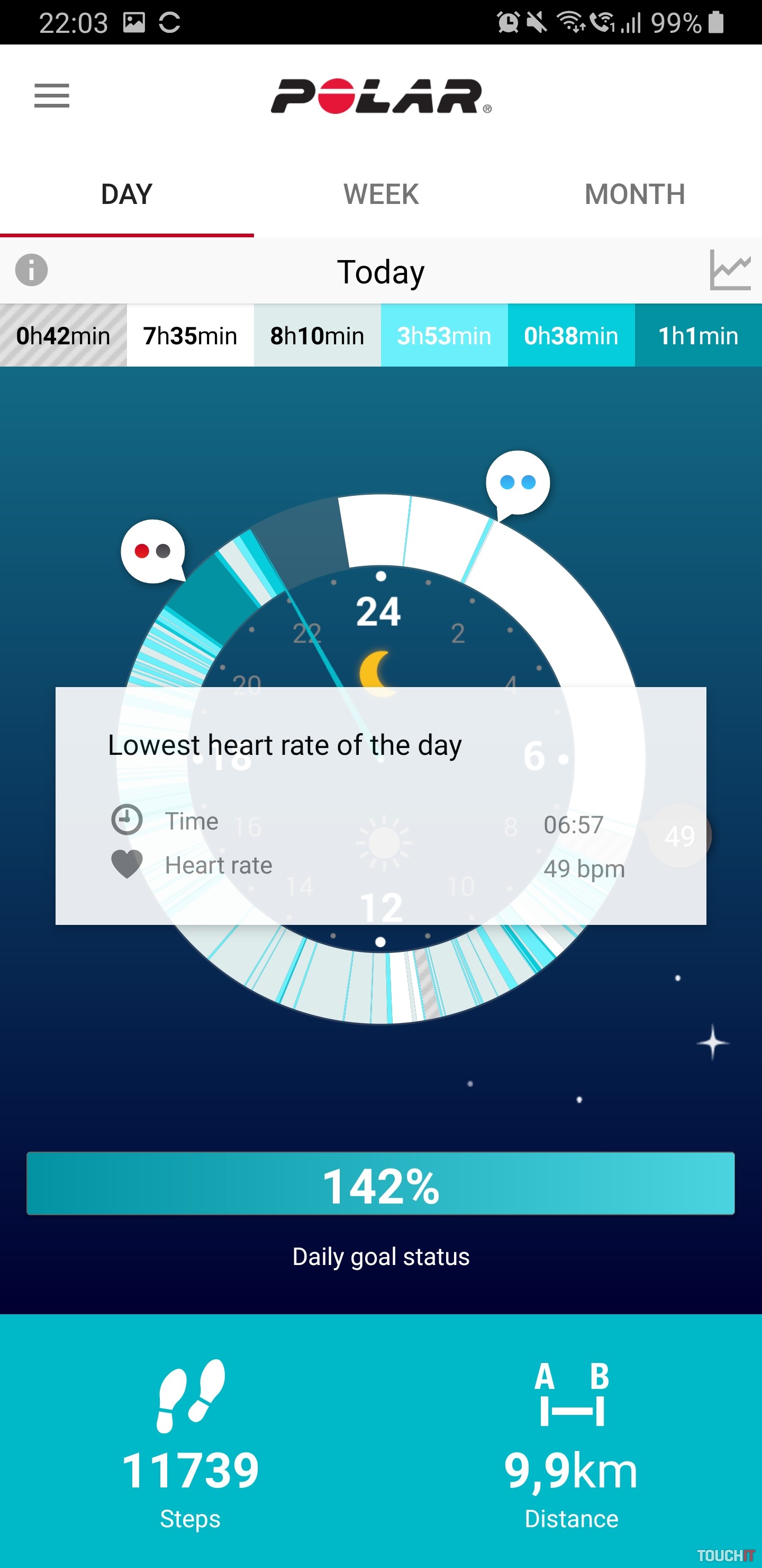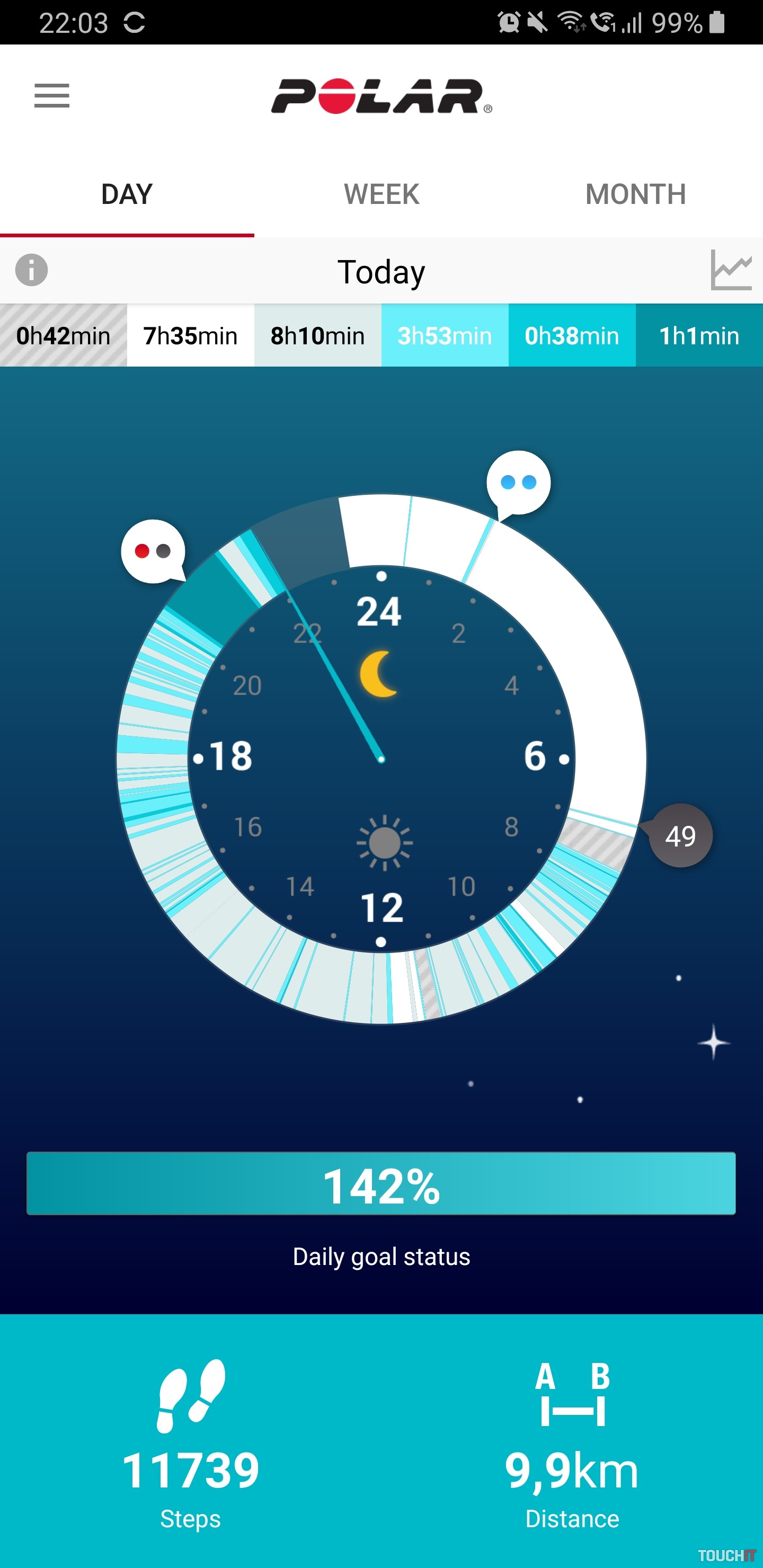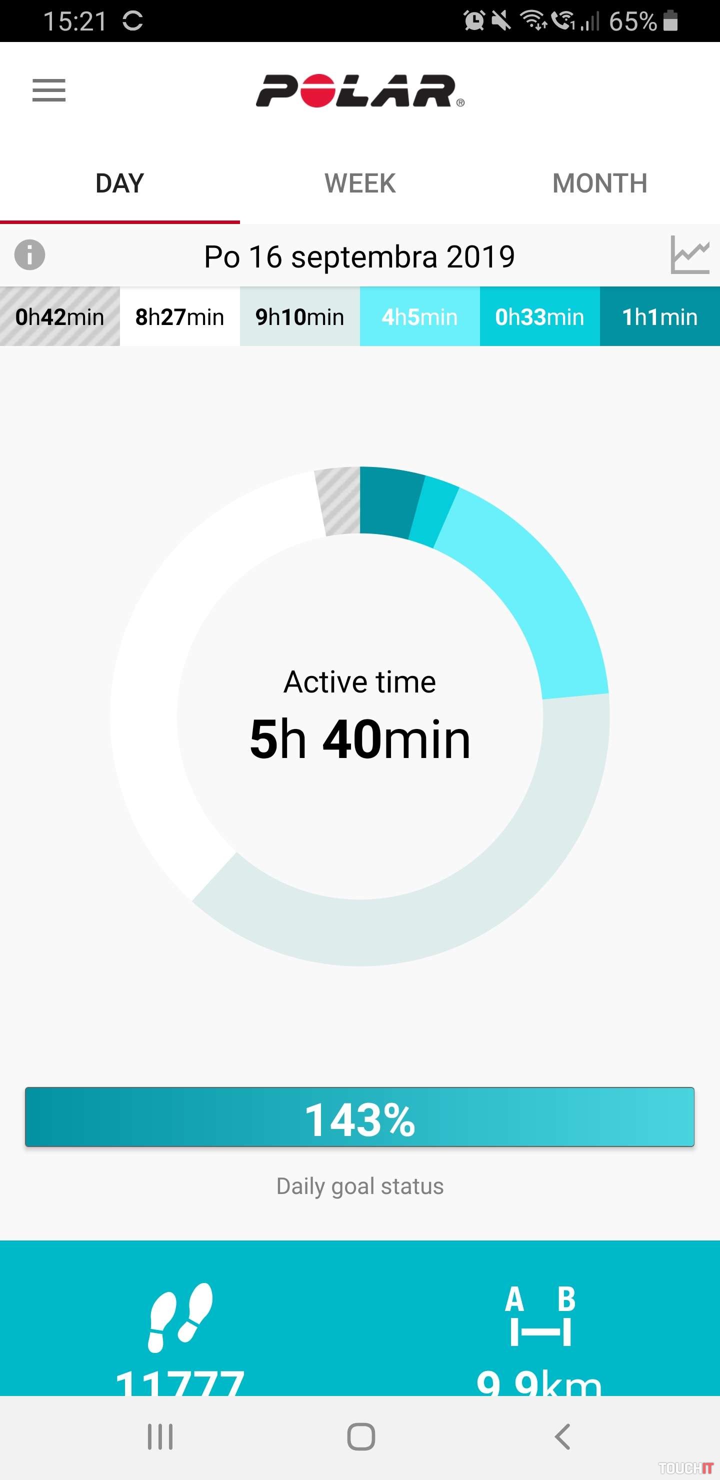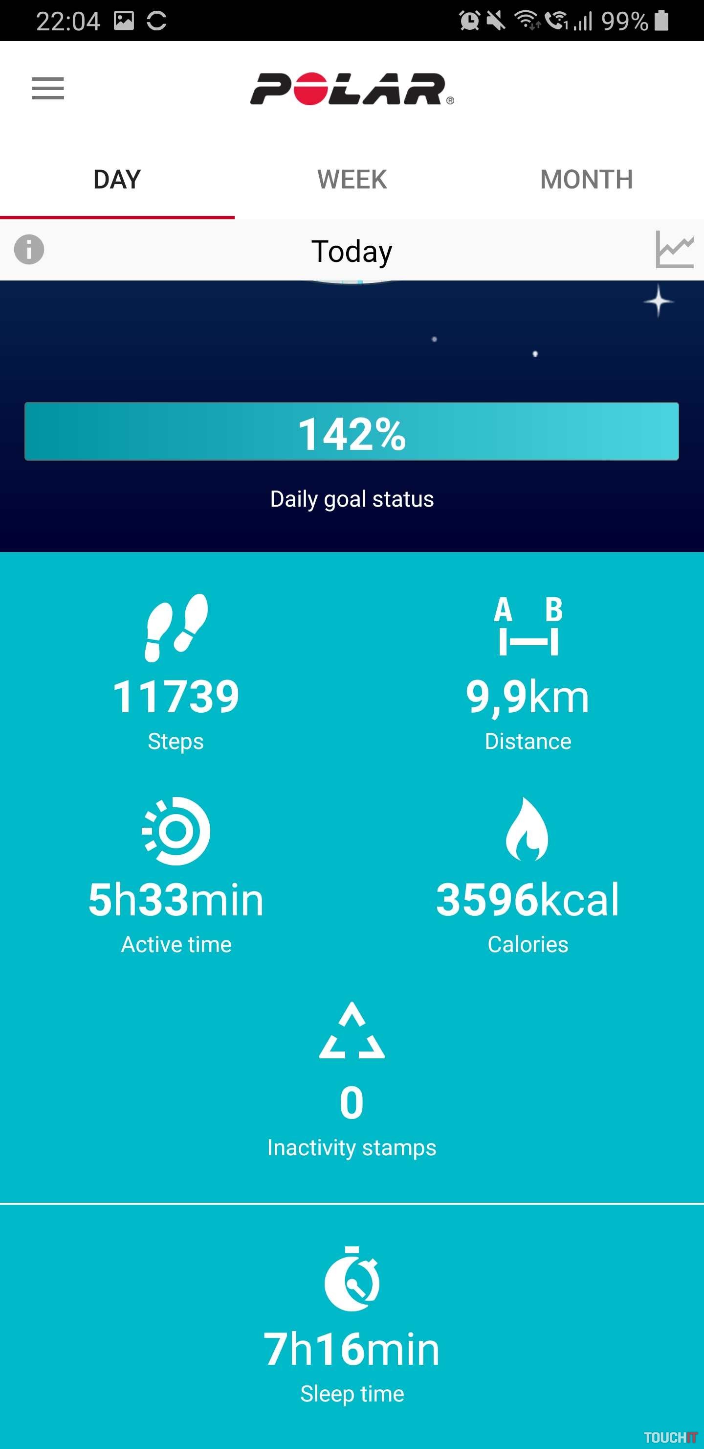 - druhá obrazovka zobrazuje pokrok aktivít počas dňa