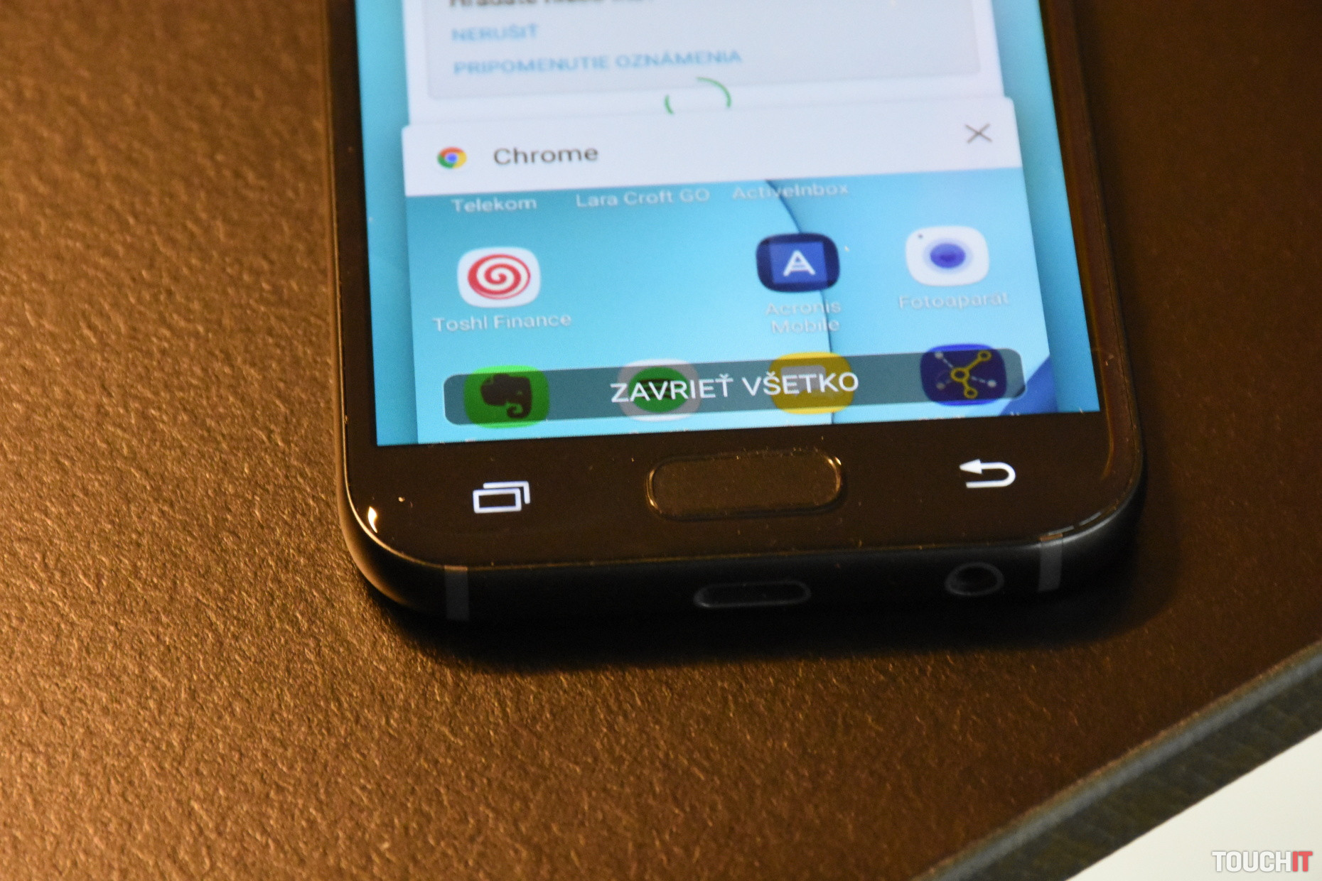 Presne ako na Galaxy S7. Vedľa neho sú tlačidlá na ovládanie. Šípka späť a na druhej strane prístup k multitaskingu. Pre pravákov ideálne, budú mať šípku späť bližšie. Možno ste si to nikdy neuvedomili, no šípku späť používate častejšie, je teda prirodzenejšie ju mať pre palec bližšie. Obe dotykové tlačidlá sú podsvietené.