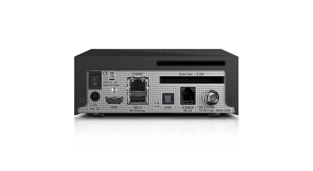 Na zadnej strane nájdeme pripojenie externého zdroja 12 V, je tu HDMI výstup, pripojenie Ethernetu, jeden USB 2.0 port, optický výstup zvuku, servisný konektor RS232, pripojenie satelitnej antény a šachta na dekódovaciu kartu. Aj tento prijímač podporuje funkciu rýchleho prepnutia kanálu vďaka integrácii FBC tunera.