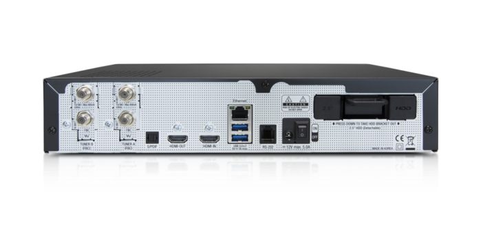 Na zadnom paneli sú dva sloty pre tunery. V štandardnej dodávke je jeden dvojitý FBC satelitný tuner DVB-S2X s 8 demodulátormi. Použiť tak môžete aj ďalší tuner, napr. pre terestriálne DVB-T/T2 alebo káblové vysielanie v norme DVB-C a C V2. Ak chcete maximum kanálov, potom vybavíte prístroj dvoma FBC satelitnými tunermi a máte až 16 demodulátorov.