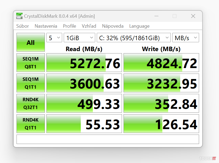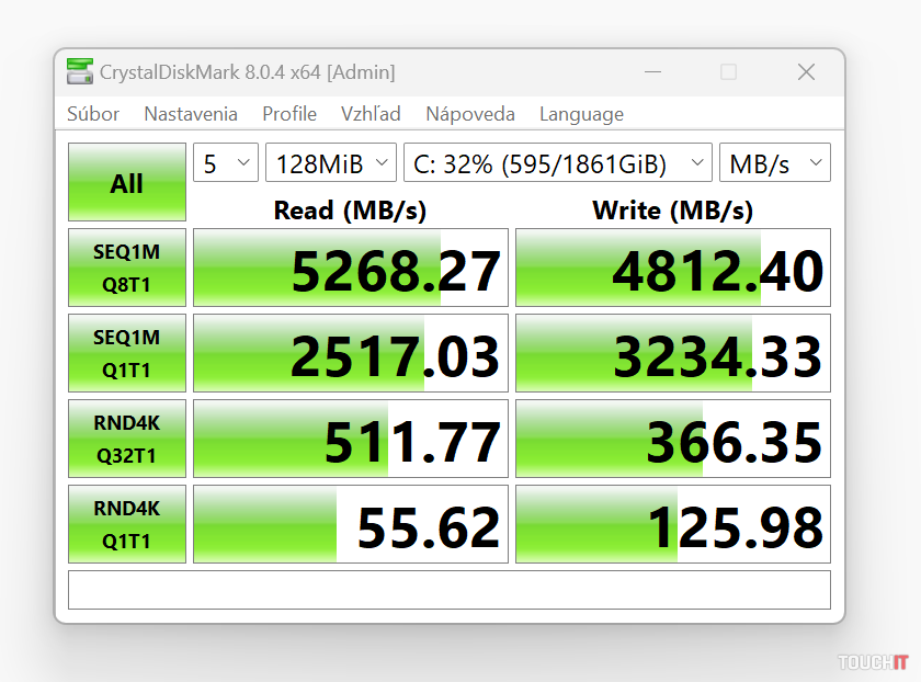 V rámci testovania 2 TB verzie disku sme namerali prenosové rýchlosti na úrovni až 5300 MB/s pre sekvenčné čítanie a 4830 MB/s pre zápis. V prípade náhodného čítania a zápisu boli veľkosti na úrovni 520 MB/s pre čítanie a 370 MB/s pre zápis. V 3DMark Storage Benchmark teste sme zaznamenali skóre 1632 bodov.