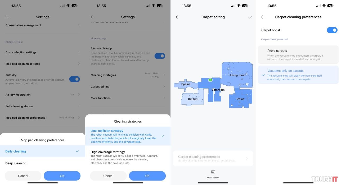 V prípade X10+ to fungovalo automaticky. Keď robot vyšiel na koberec, rozpoznal ho a kotúče nadvihol. Alebo sa mu úplne vyhol – v závislosti od nastavenia v aplikácii.