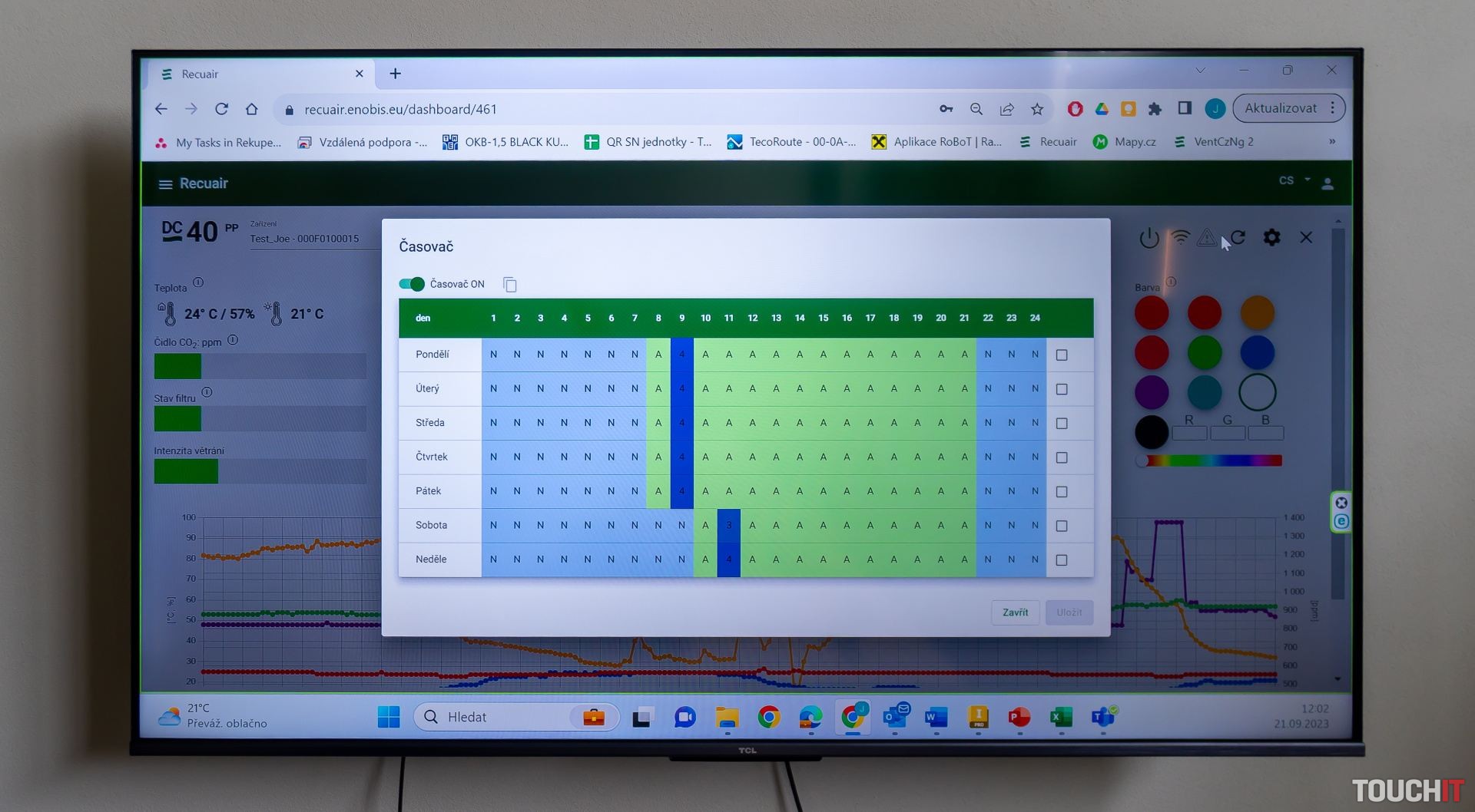 V prehľadnejšom grafickom zobrazení si môžete nastaviť časovač pre rekuperáciu, prípadne obísť rekuperáciu, aby ste dosiahli chladenie izby zvonka.