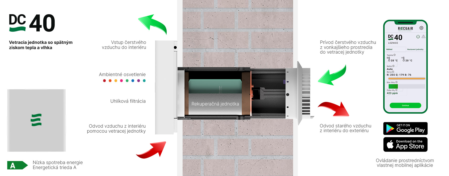 Recuair kontinuálne odvádza vydýchaný vzduch von a súčasne privádza čerstvý vzduch cez systém filtrácie do interiéru a optimalizuje vlhkosť. Inteligentná jednotka vzduch vo vnútri v zime neochladzuje a v lete neotepľuje – teda teplota vo vnútri objektu sa počas vetrania nemení. Vetranie je trvalé, efektívne a bez energetických nákladov zapríčinených nevyhnutnou úpravou teploty (klimatizácia/vykurovanie).