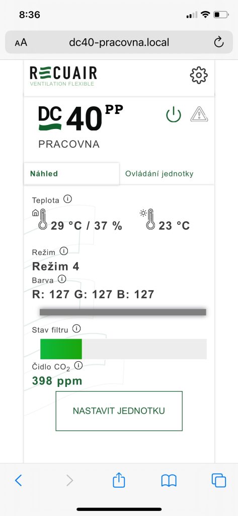 K systému je k dispozícii mobilná aplikácia pre iOS a Android, ktorá vám pomôže jednotku na WiFi nájsť a pripojiť sa k nej. Získate tým informácie o stave filtra, môžete s ňou nastaviť ambientné podsvietenie, prípadne režim práce (Auto, Dovolenka, Bypass) aj informácie o nameraných hodnotách. Označenie aplikácie je Recuair Ventilation remote WiFi control. Hluk samotnej jednotky pri prevádzke je max. 25 dB, teda ho sotva budete počuť.