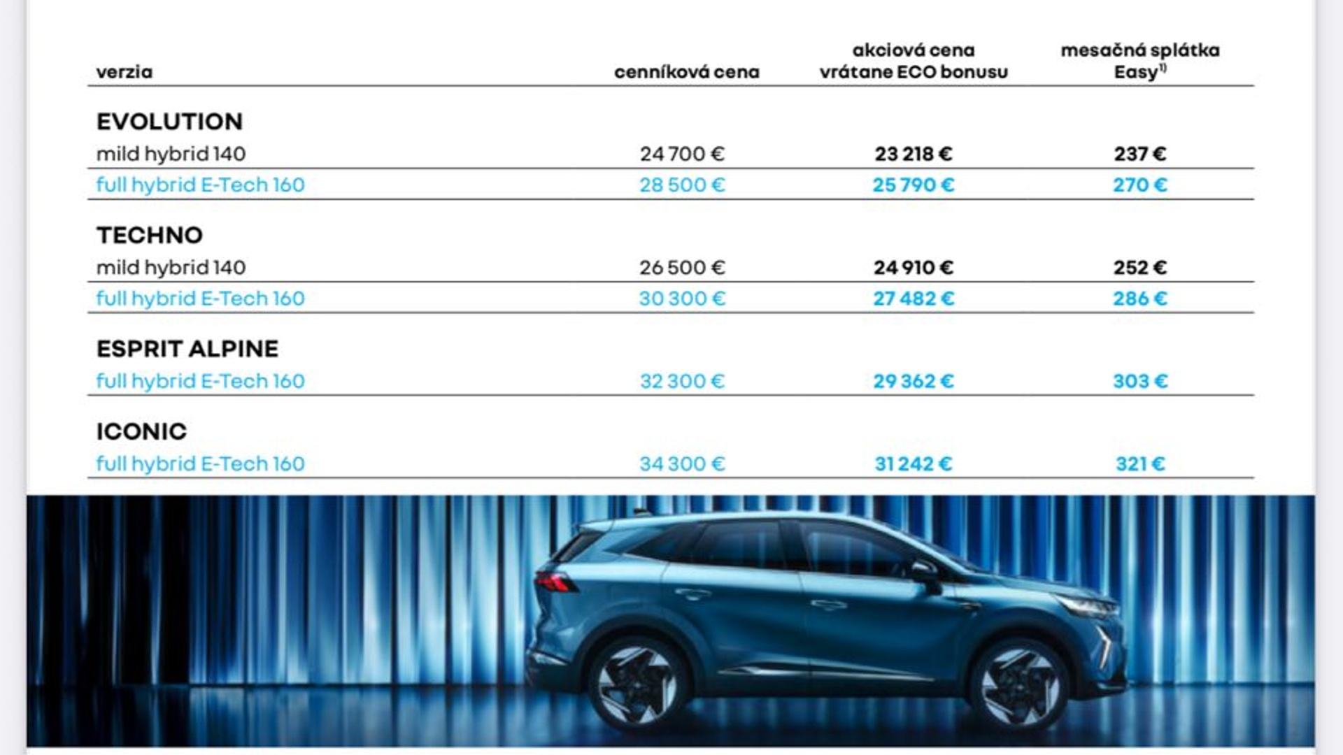 Nová pohonná jednotka Full Hybrid E-Tech s výkonom 160 koní a objemom 1,8 litra, dostupná pre model Symbioz (stredná trieda segmentu C), sa môže pochváliť nízkymi emisiami 98 g/km CO₂ a spotrebou len 4,3 l/100 km podľa normy WLTP.