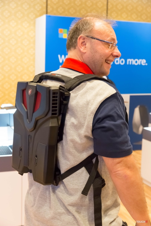 Názov tohto čuda je MSI VR One a videli sme ho vo finálnej verzii. Potvrdzujeme, že sa dá nosiť na chrbte veľmi ľahko (s batériami má 3,6 kg), vo vnútri je najnovší procesor Intel Core i7, grafická karta GTX 1070, na hornej strane je rad prepojovacích portov vrátane 4 x USB 3.0 a jeden HDMI.