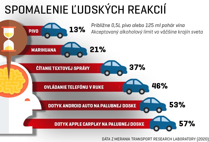 Ak následne rovno sadnete za volant, vaše reakcie sa zhoršia v priemere o 13 %. To v porovnaní s 53 až 57 % stratou pri používaní dotykových displejov na palubných doskách vyzerá ako nič. Bledne pri tom aj riadenie pod vplyvom marihuany (21 % strata) a dokonca aj riadenie so smartfónom priamo v ruke (strata 35 až 46 %). Je to zrejme dôsledkom toho, že telefón si dávame bližšie k sebe a ovládame ho palcom, na rozdiel od palubnej dosky, ku ktorej sa načahujeme s vystretým ukazovákom.