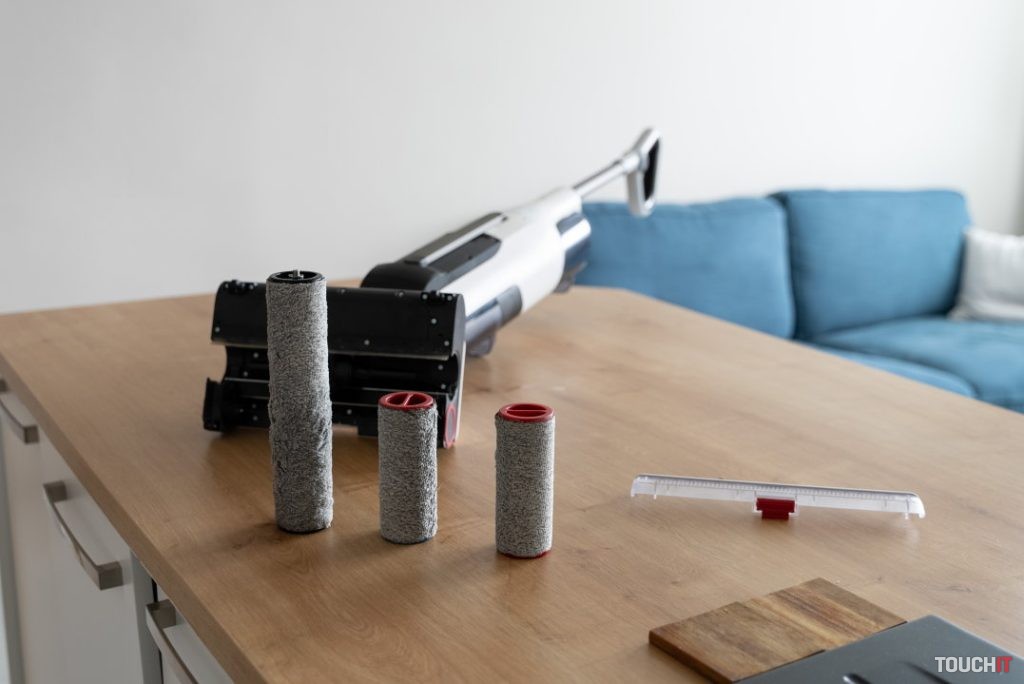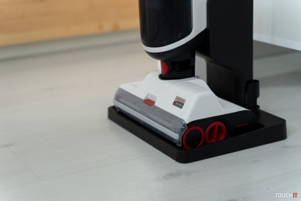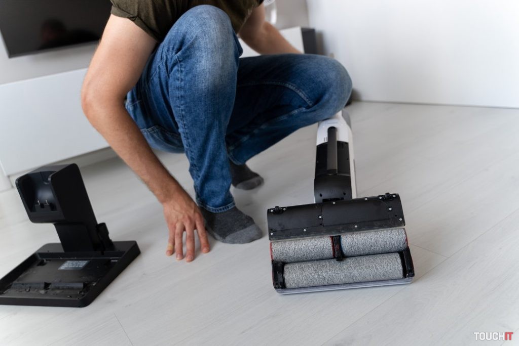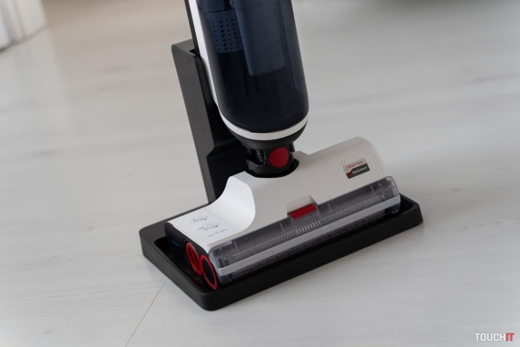 Súčasťou balenia je tiež plastová dokovacia stanica s napájacím káblom. Mopovač by ste v nej mali uchovávať, aby sa vám nepoškodil drevený povrch podlahy a zároveň v stanici prebieha aj program samočistenia valcov. V balení nájdete aj kefku na vyčistenie filtrov, prípadne na odstránenie namotaných vlasov z čistiacich valcov.