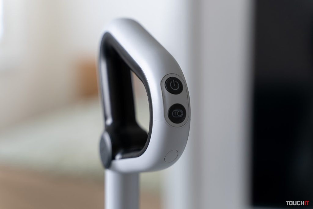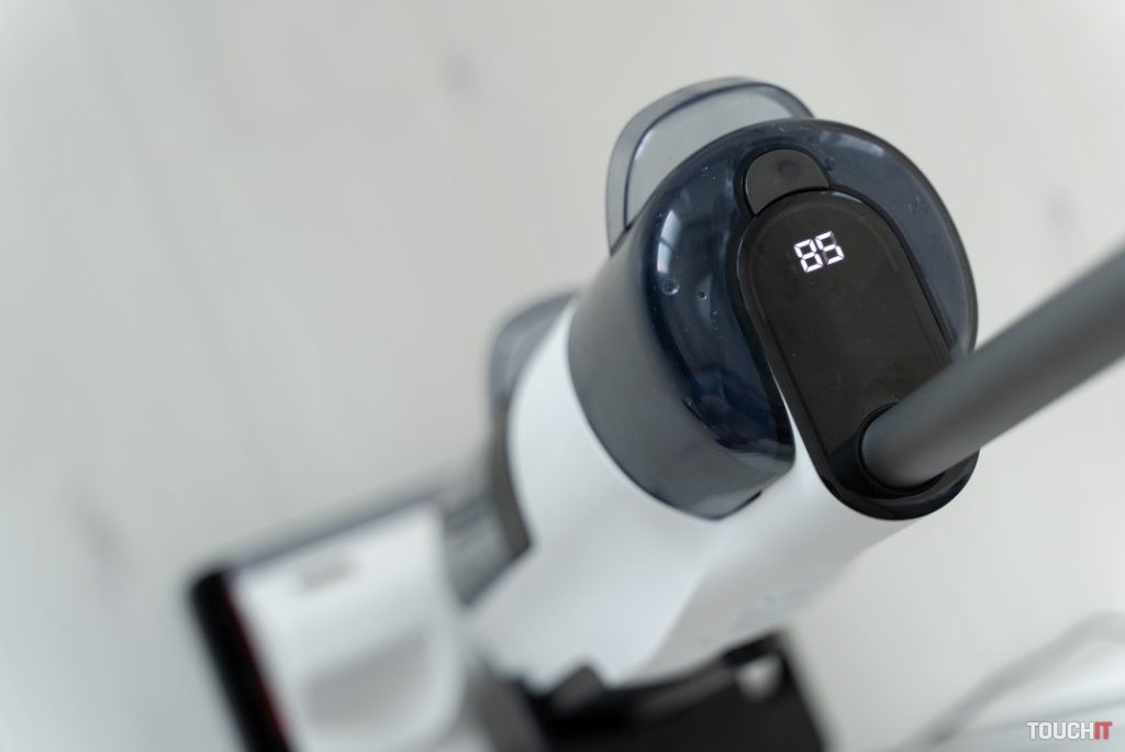V hornej časti centrálnej jednotky sa nachádza displej, ktorý zobrazuje dôležité informácie o stave nabitia batérie, úrovni znečistenia, aktivovaného módu čistenia a iné dôležité hlásenia. Hliníková rúčka mopovača je zakončená trojuholníkovou plastovou rukoväťou s troma tlačidlami na ovládanie.