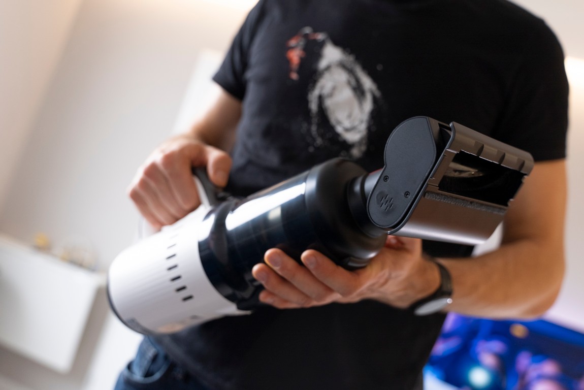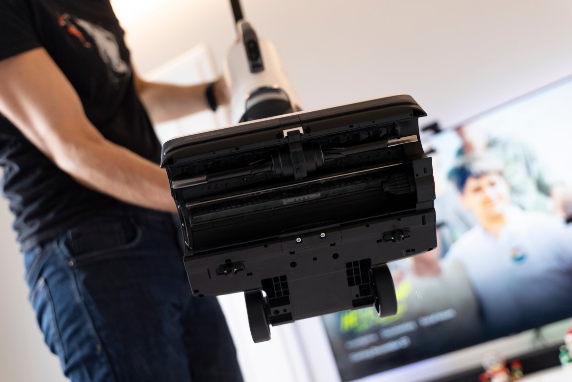Zaujímavosťou je práve hlavná mopovacia jednotka. Tá v sebe totiž skrýva vysávací modul, ktorý sa používa ako pri mopovaní, tak aj pri vysávaní. Jednoduchým stlačením tlačidla tento vysávací modul vyberiete a pridaním zbernej nádoby na prach a vhodného nadstavca premeníte mopovač na klasický tyčový vysávač. K tomu sa však ešte dostaneme neskôr.