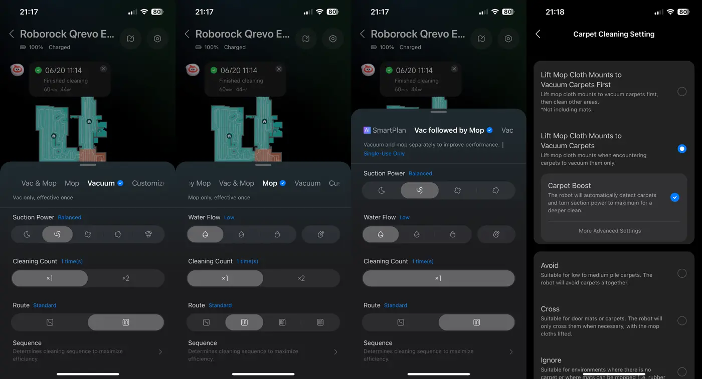 Režimy samostatného vysávania a mopovania ponúkajú viac možností ako kombinovaný režim. Môžete si nastaviť ešte vyšší sací výkon a v režime mopovania aj hustejší pohyb. Môžete si zvoliť z troch predvolených vlhkostí alebo si cez pokročilé nastavenie vybrať úroveň od 1 do 30.
