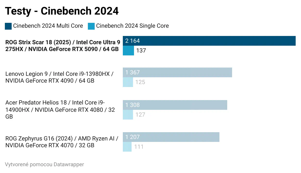 Výsledky som porovnal s minulou generáciou, s notebookom Strix SCAR s grafickou kartou GeForce RTX 4090. V porovnaní s ním je nárast výkonu iba 20 %. Platí to pre hrubý výkon v mnohých grafických testoch. Hlavný prínos série RTX 50 z hľadiska bežného hrania však spočíva najmä v podpore technológie DLSS Multi Frame Generation, ktorá je dostupná iba pre najnovšiu sériu grafických kariet a pomocou umelej inteligencie dokáže generovať až tri snímky na jedno vykreslenie.