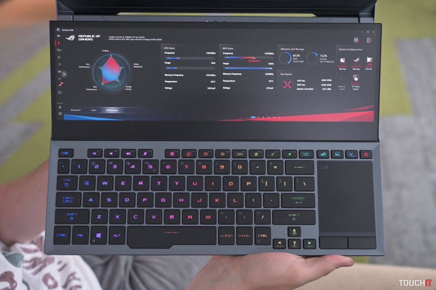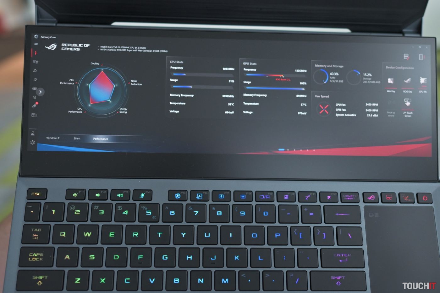 Notebook má 15,6-palcový matný displej s tenkými rámikmi po troch stranách. Webkameru by ste hľadali zbytočne, k dispozícii je externá kamera, ktorá je súčasťou balenia. Obrazovka má rozlíšenie 4K a 60 Hz obnovovaciu frekvenciu. K dispozícii bude aj Full HD verzia s frekvenciou 300 Hz. Predpokladáme však, že notebook si poradí aj s hrami v 4K rozlíšení, obsahuje ten najvýkonnejší mobilný grafický čip na trhu. Druhý displej sa nachádza nad klávesnicou a ponúka rozlíšenie 3840 × 1100 pixelov. Je dotykový a matný a funguje rovnakým spôsobom, ako keby ste k notebooku pripojili monitor – na druhý displej si môžete prenášať aplikácie a mať tak k dispozícii potrebné informácie aj počas hrania. Napríklad si môžete otvoriť program ARMOURY CRATE a sledovať vyťaženie a teplotu procesora a grafickej karty počas hrania. Alebo môžete pri hraní takýmto spôsobom komunikovať či sledovať otázky od ľudí počas streamovania.ROG Zephyrus Duo 15 GX550