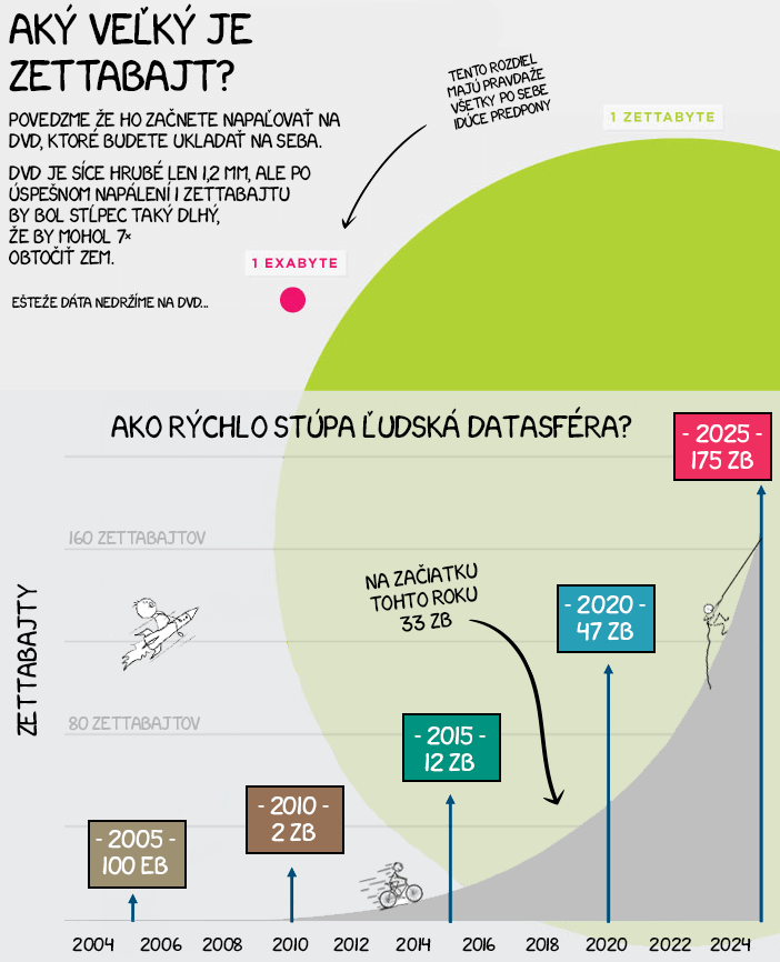 Z tejto relatívne nedávnej dvojice je v rámci IT odvetvia potrebná predpona Zetta, konkrétne pre spomenutý Zettabajt. Toto obrovské číslo sa používa pre celkovú dátovú kapacitu všetkých digitálnych dát ľudstva. V súčasnosti ide o 33 zettabajtov, pričom ešte v roku 2015 to bola len tretina tejto hodnoty. V minulej dekáde sme dokonca rátali dáta ľudstva ešte „len“ na exabajty.