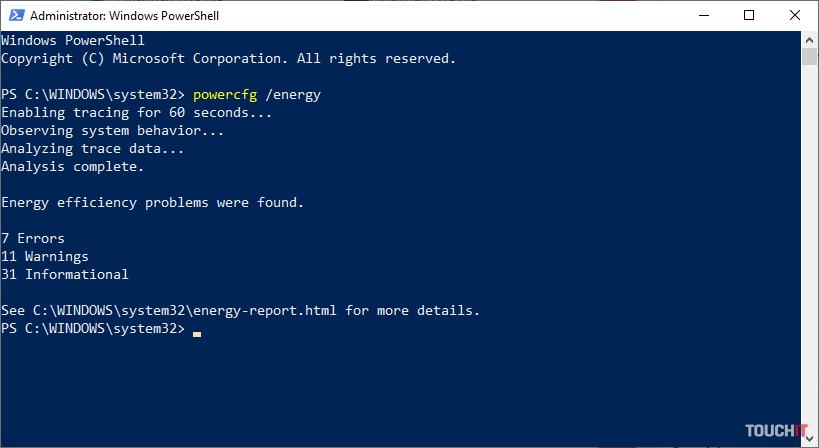 Zapnite PowerShell. Nájdete ho v ponuke Štart zadaním jeho názvu. Kliknite naň pravým tlačidlom a vyberte možnosť Spustiť ako správca. Do príkazového riadku napíšte powercfg /energy a stlačte Enter. Tento proces potrvá minútu a počas neho nechajte okno PowerShellu otvorené. Potom sa zobrazí správa o výsledku prehľadávania. Hodnotenie je rozdelené na tri stupne – chyby, varovania, informačné.
