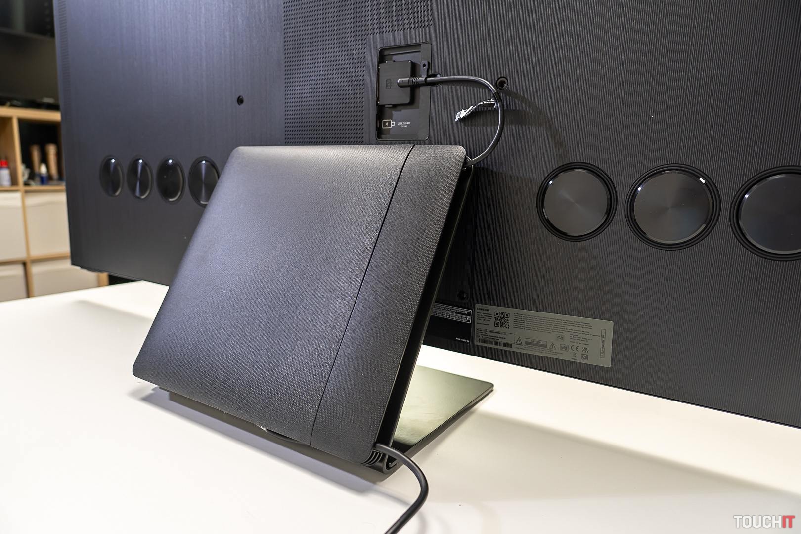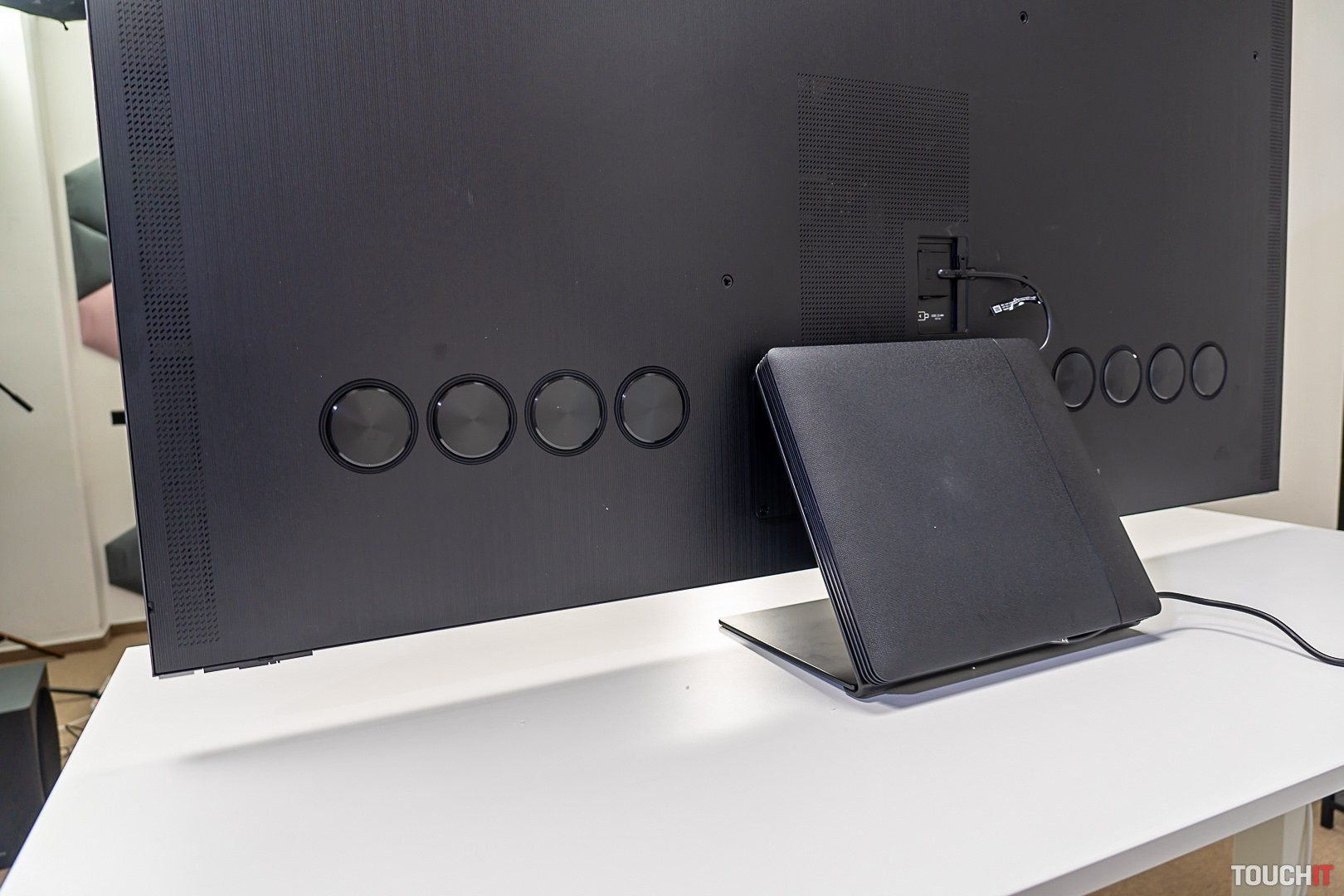 Samsung v tomto prípade používa odnímateľný One Connect Box, čo znamená, že spleť káblov môžete nechať na mieste, ktoré je mimo dohľadu očí. Samotný box je prepojený len pomerne tenkým káblom a takto sa dostáva do televízora aj napájanie. V balení dostávate dva prepojovacie káble – jeden krátky, ktorý sa využije pri umiestnení boxu za televízorom a potom dlhý, ktorý využijete vtedy, keď One Connect Box chcete ukryť napr. pod televízorom.
