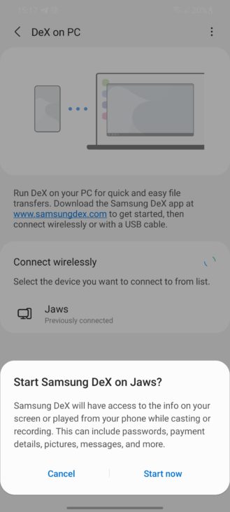 Pokiaľ chcete funkciu využívať, je potrebná aktualizácia na najnovšiu verziu klienta DeX v PC. Stlačte klávesovú skratku DeX v rýchlych nastaveniach telefónu a zvoľte DeX na PC. Následne vyberte zo zoznamu požadované zariadenie a pripojte sa. V tomto okamihu sa zobrazí výzva na pripojenie samotného počítača – stojí za zmienku, že to nefunguje, ak máte aktívnu funkciu Link to Windows, takže pred spustením DeX-u ju bude potrebné vypnúť.