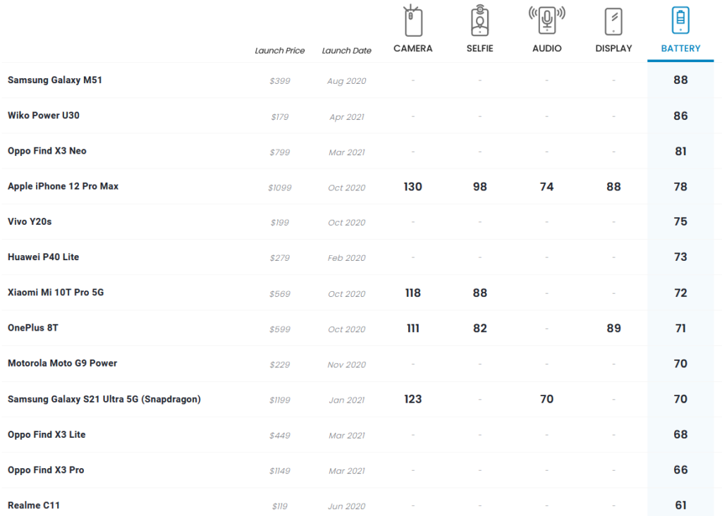 Tento smartfón má obrovskú 7000 mAh batériu, (aj) vďaka čomu získal momentálne najvyššie skóre 88 bodov. Na jedno nabitie bol schopný fungovať viac ako 3 dni. Na druhom mieste sa umiestnil málo známy smartfón Wiko Power U30 s 6000 mAh batériou. Prvú trojku uzavrel iPhone 12 Pro Max.