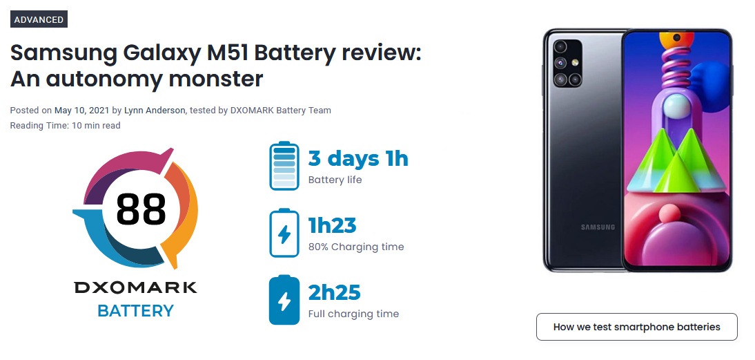 Testeri z DxOMark sa okrem testovanie fotoaparátov a audia, začali zameriavať aj na batérie smartfónov. Aj keď existuje veľa otázok ohľadom objektivity ich hodnotení, to im nebráni v rozširovaní pôsobenia. V najnovšom hodnotení odhalili lídra v oblasti výdrže batérie, ktorým sa stáva Samsung Galaxy M51.