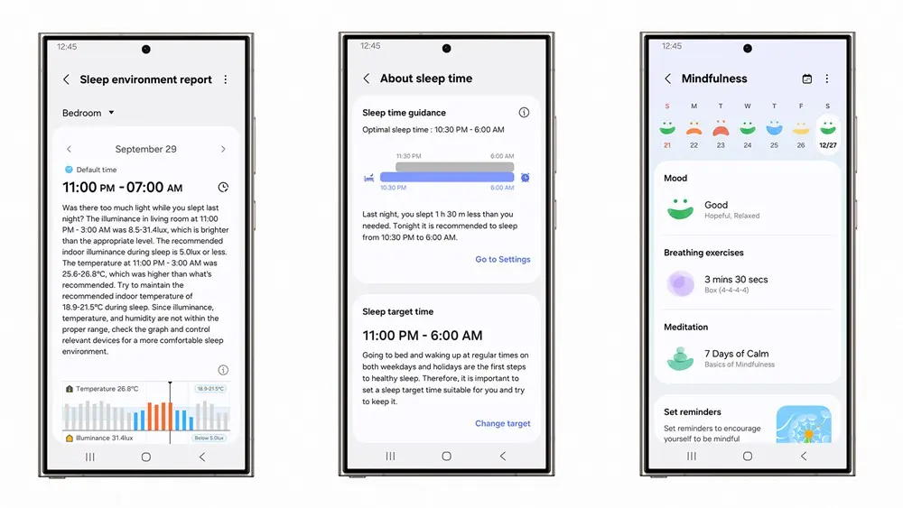 Medzi nové funkcie patria informácie o okolitom prostredí pri spánku (vyžadujú sa zariadenia inteligentnej domácnosti s podporou platformy SmartThings), rady ohľadne dĺžky spánku a monitorovanie mindfulness, čiže vnímavosti. V rámci tejto funkcie vám aplikácia umožní monitorovať nálady a poskytne rôzne rady a návody na dýchacie cvičenia a meditácie.