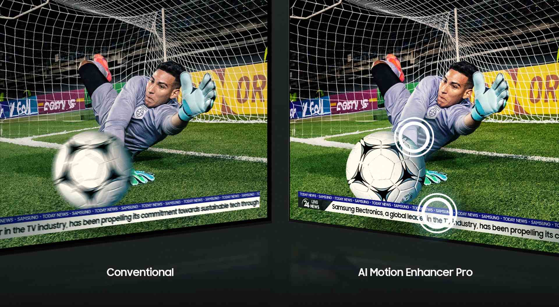 - AI Motion Enhancer Pro: Eliminuje nedostatky pri vykreslení veľmi rýchleho pohybu, predovšetkým pri športových prenosoch. Aj za touto funkciou stojí nový procesor NQ8 AI Gen3. Systém automaticky rozpozná prenášanú športovú disciplínu (futbal, hokej, tenis, …), zameria sa na rýchly pohyb lopty a pomocou hlbokého strojového učenia obraz upraví