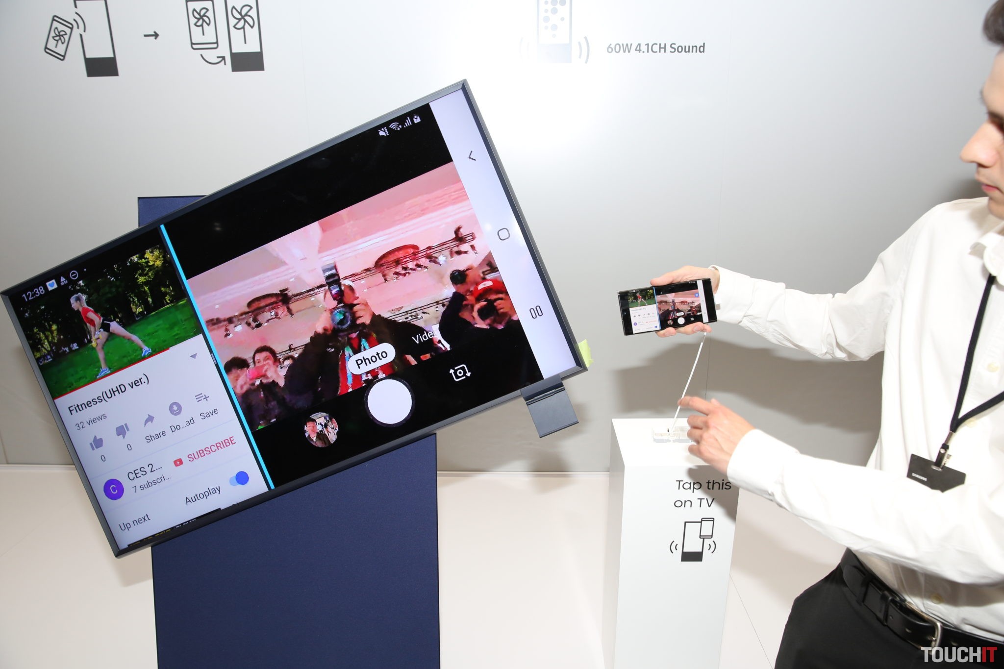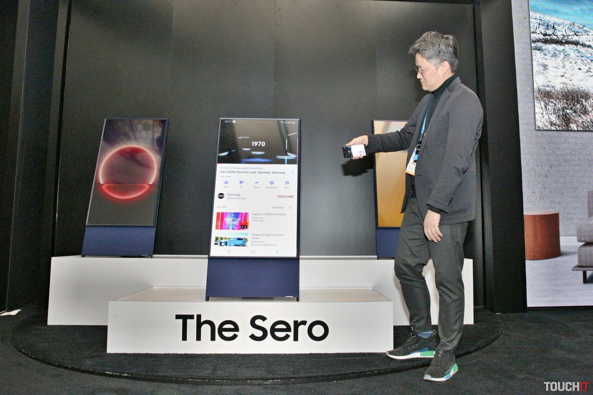 Okrem iného Samsung predstavil televízor s označením The Sero (kórejsky vertikálny). Je to model, ktorý po spárovaní s mobilom dokáže meniť svoju orientáciu. Z polohy na šírku sa zmení na výšku a opačne. presne podľa toho, ako hýbete svojím mobilom. Spárovanie vyzeralo zaujímavo, lebo mobilom bolo treba mierne poklepať po hrane televízora (Tap View).