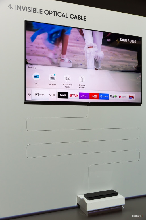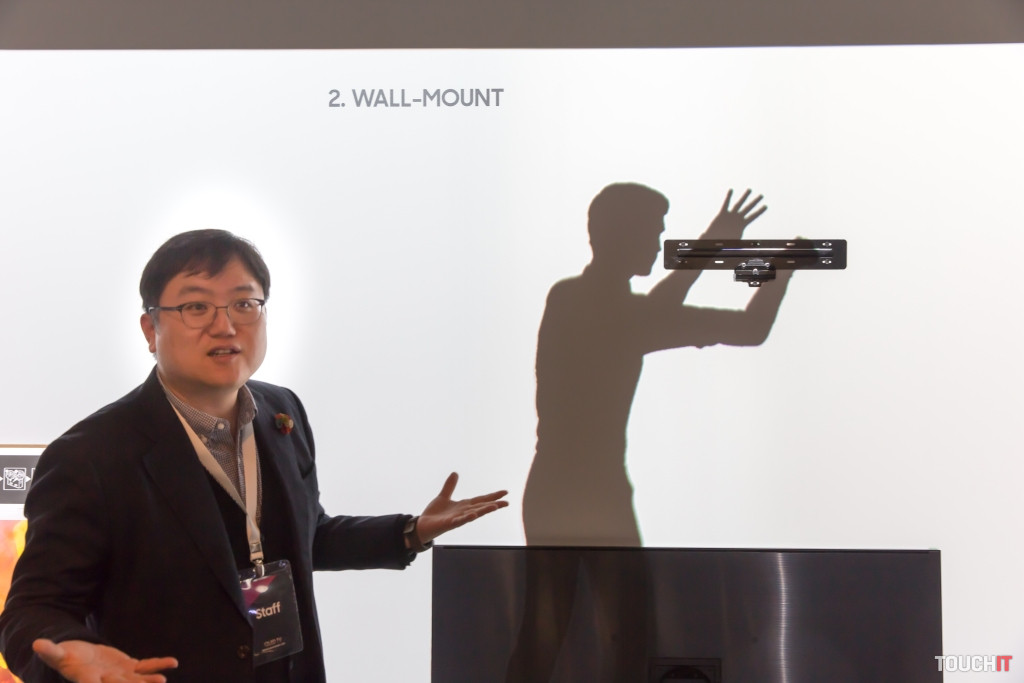 Ako sme sa dozvedeli na hodine otázok a odpovedí s hlavným návrhárom týchto televízorov, až 80 % ľudí si želá mať televízor pripevnený na stene, ale len 20 % to aj naozaj urobí. V minulosti bola dôvodom hlavne technická náročnosť takéhoto umiestnenia televízorov. Situáciu mení úplne nové príslušenstvo ku QLED televízorom, ktorým je držiak na stenu. Ako sme videli, celá montáž trvá asi 15 minút a počas nej používateľ sám na stenu pripevní podstavec, nasadí naň televízor, pričom má ešte aj možnosť jemne upraviť jeho zarovnanie. Spojenie medzi televízorom a prepojovacím blokom (connect box) sa realizuje pomocou tenkého priesvitného kábla s dĺžkou 5 metrov. Zakúpiť je možné aj kábel s dĺžkou 15 metrov.