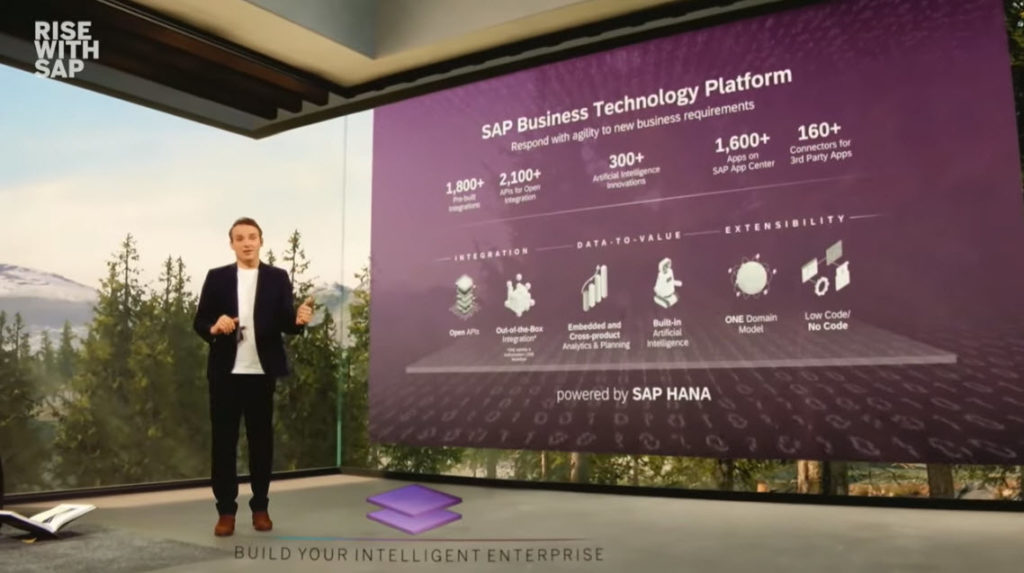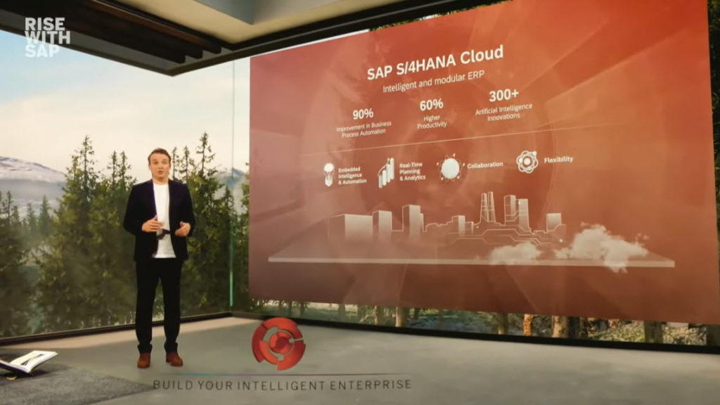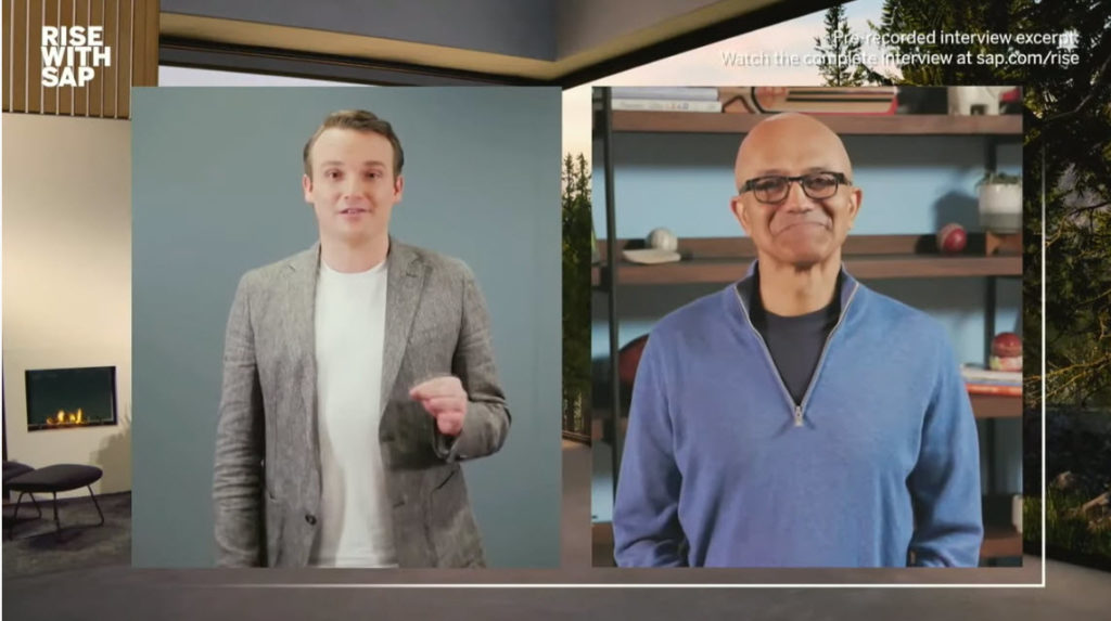 Hovoríme o službe RISE with SAP. Na on-line podujatí vystúpil CEO spoločnosti SAP Christian Klein a hostia, ako bol CEO Microsoft Satya Nadella či predstavitelia firiem Siemens a LIVEKINDLY. Nemecký koncern SAP tým demonštroval spojenie so silnými firmami vo svojom odbore.