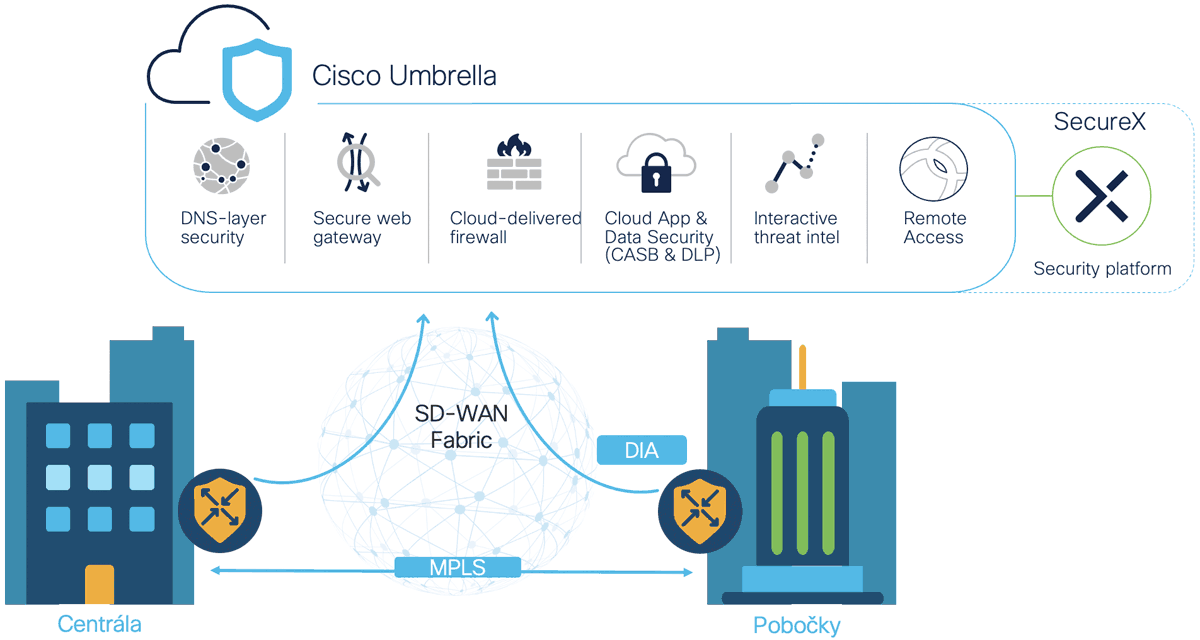 Bezpečnostné funkcie poskytované z cloudu sú zastúpené službou Cisco Umbrella. Ponúka spoľahlivú ochranu komunikácie nielen pre mobilných pracovníkov, ale aj pre pracovníkov z pobočiek a centrály. Cisco Umbrella chráni firemnú komunikáciu na viacerých vrstvách, počnúc ochranou DNS (Domain Name System), cez filtrovanie dátových tokov cez firewall spolu s funkciami IPS (Intrustion Prevention System) až po hĺbkovú inšpekciu webovej prevádzky spolu s dešifrovaním ako aj s možnosťou izolovania aktivity webového prehliadača aby nedošlo k infikovaniu koncového zariadenia. Umožňuje analyzovať firemnú komunikáciu na prítomnosť citlivých informácií pomocou CASB a využíva znalostnú databázu ako aj výsledky výskumu bezpečnostného tímu Cisco TALOS. Keďže sú všetky tieto funkcie dostupné z jednej platformy, Cisco Umbrella výrazne znižuje čas aj náklady potrebné na nasadenie, konfiguráciu aj prevádzku takto uceleného riešenia. Spolu s Cisco Umbrella má zákazník k dispozícii bezplatne aj platformu Cisco SecureX pre vizualizáciu bezpečnostných udalostí, riešenie bezpečnostných incidentov a orchestráciu.