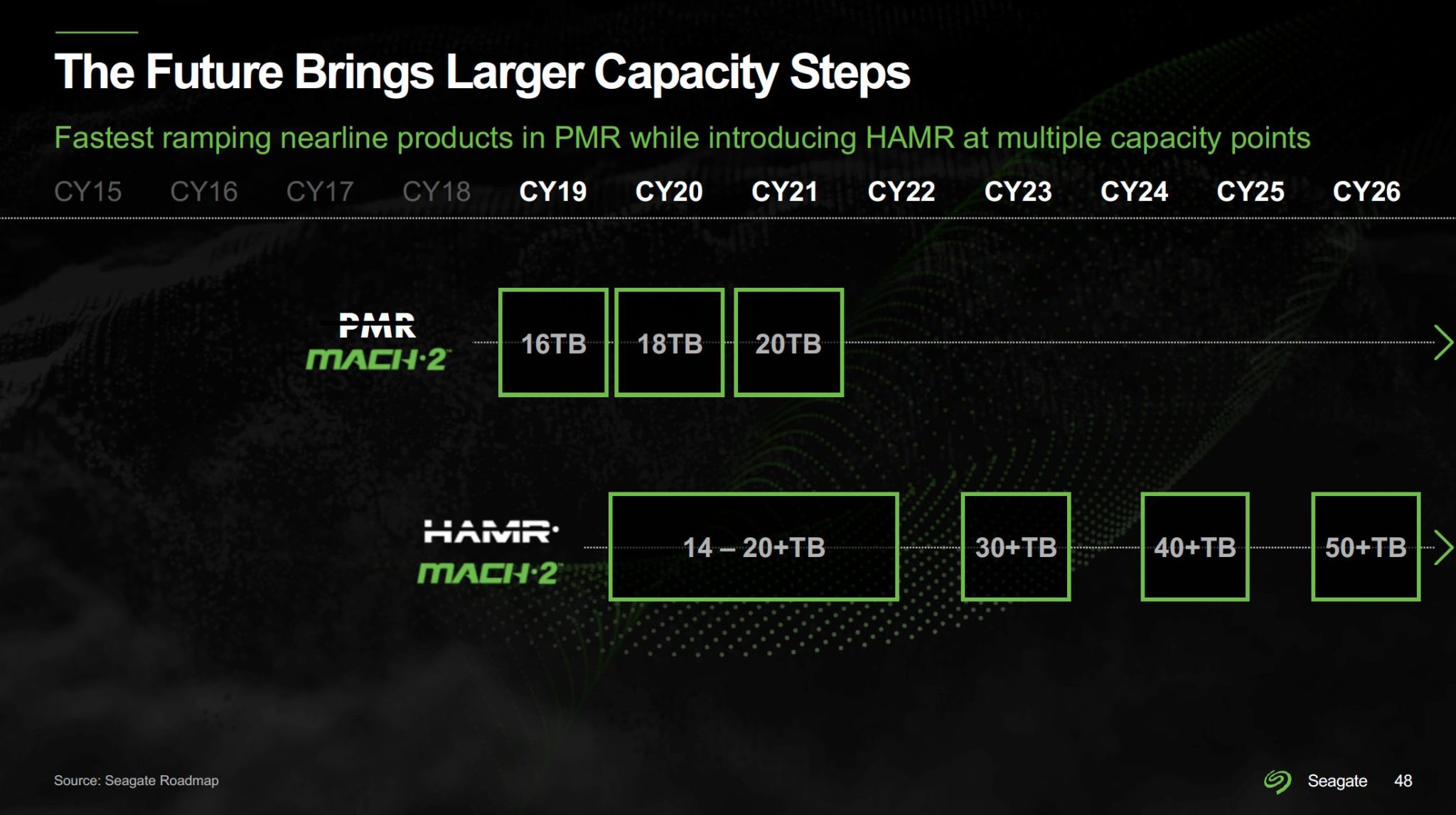 Dnes si môžete kúpiť pevné disky Seagate IronWolf Pro, ktoré majú maximálnu kapacitu 22 terabajtov. Konkurenčná firma Western Digital takisto používa technológiu HAMR na to, aby dosiahla čo najvyššiu hustotu zápisu, a teda aj najväčšiu kapacitu v takpovediac jednom balení disku. Vo finále by sme sa mali dočkať uvedenia 40 TB disku už budúci rok alebo v roku 2025 a 50 TB varianty by mohli byť dostupné od roku 2026. Firma má smelé plány a podľa predchádzajúcich stanovísk chce dosiahnuť cieľ hranice 100 terabajtov do konca desaťročia.