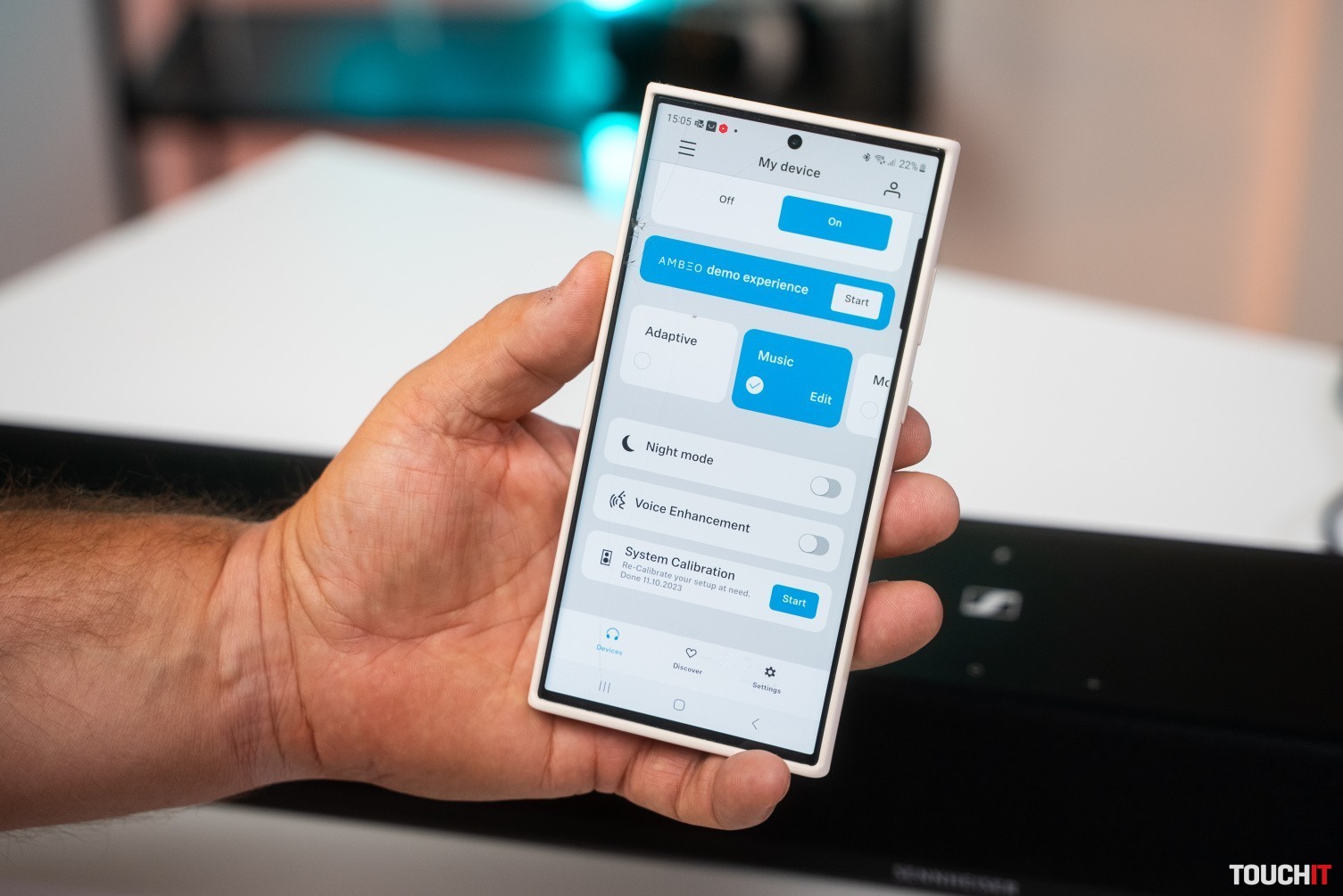 Ambeo Soundbar Plus funguje v režime domáceho kina 7.1.4 s hudobným výstupom až 400 W. Kalibrácia testuje akustiku konkrétnej miestnosti a prispôsobuje zariadenie danému prostrediu. Detailná kalibrácia sa dá spustiť aj samostatne a trvá približne 3 minúty. Sprevádzaná je zaujímavými zvukmi, z čoho je jasné, že to robí poctivo.